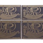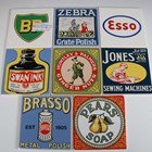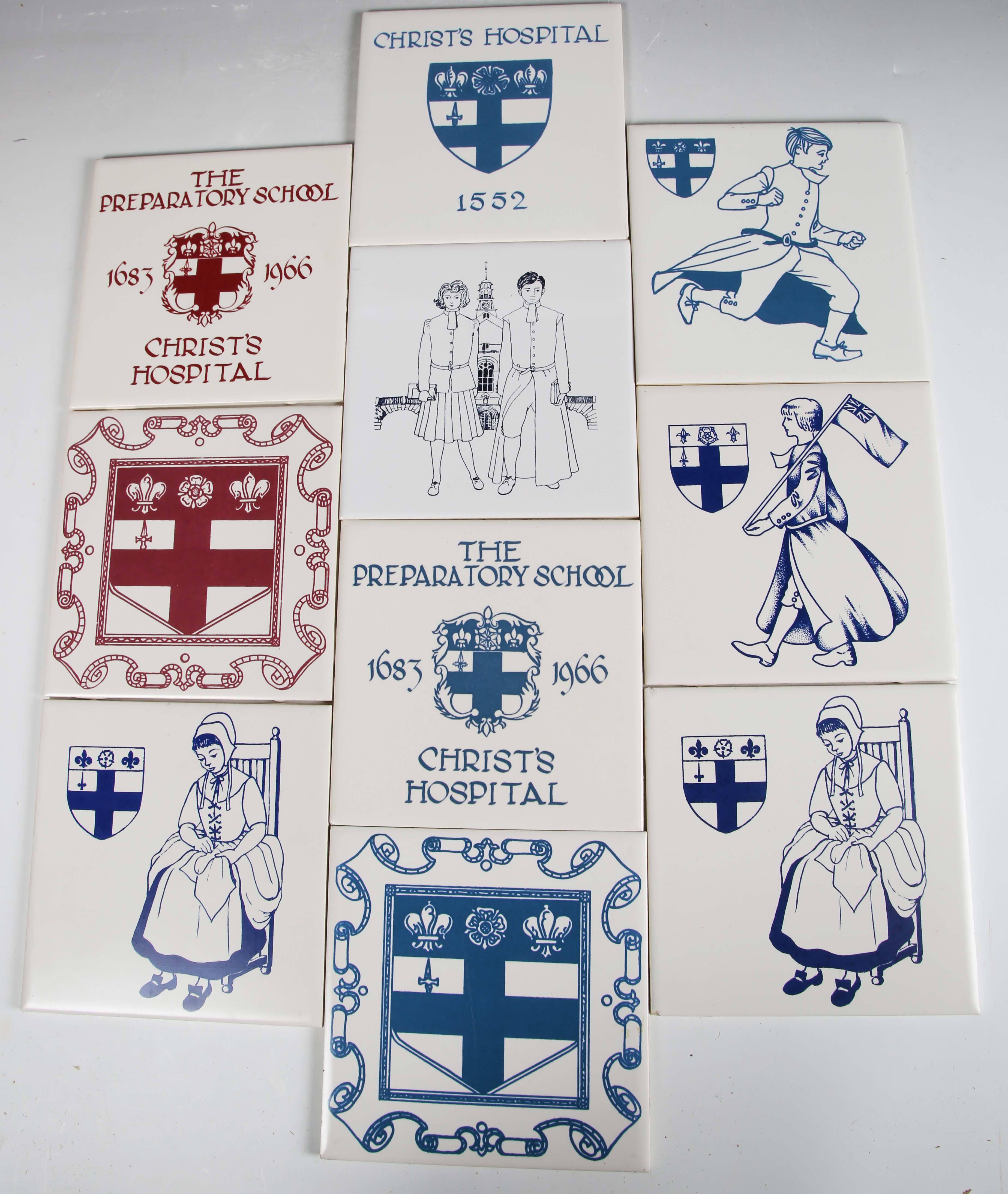 Ten Pilkington’s tiles relating to Christ’s Hospital, Horsham, eight different designs in two colourways, each 15.3cm square, eight Pilkington’s vintage advertisement tiles for BP, Zebra Grate Polish, Brasso Metal Polish, Pears’ Soap, Jones’ Sewing Machines, Huntley & Palmers Ginger Nuts, Swan Ink and Esso, other commemorative and fundraising tiles, including Trinity School and Royal Manchester Children's Hospital Pendlebury, a Richard Dennis Pilkington’s tile exhibition invitation, a factory trial tile painted with a shield and other commemorative tiles by Pilkington’s. Provenance: Blanchett Collection.