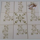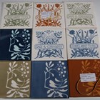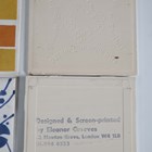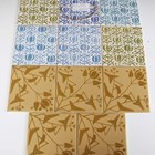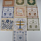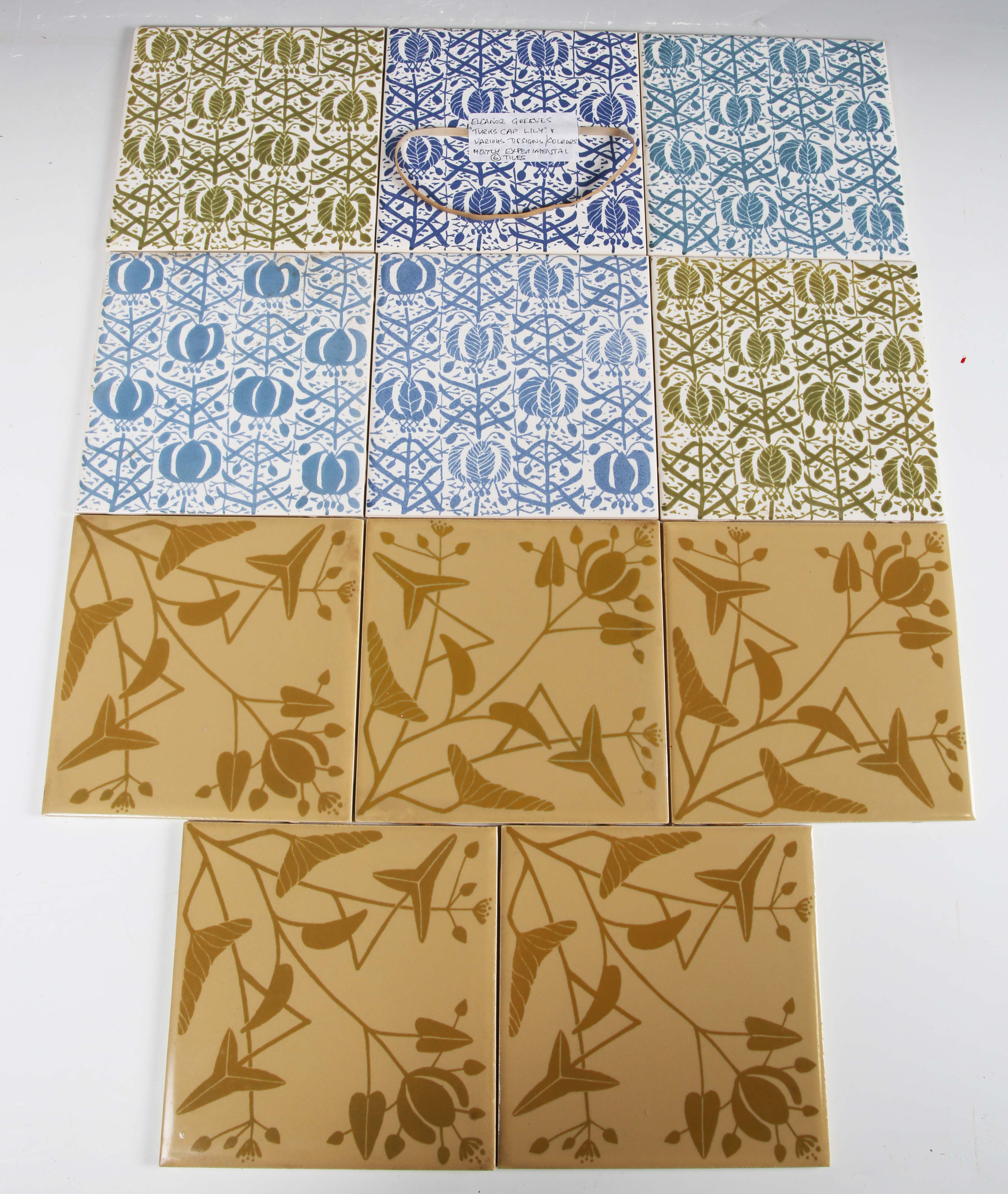 A mixed group of H & R Johnson dust pressed screen-printed tiles, designed by Eleanor Greeves, approximately fifty, including four large experimental tiles with annotated backs, seven small tiles with block colour samples, five large tiles with a Herb design, a small nine tile panel in the Traveller’s Joy pattern, nine large commemorative tiles, including one for Kew Gardens, and some large experimental tiles in the Turk’s Cap Lily pattern. Provenance: Blanchett Collection.