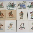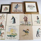 A mixed group of mainly 15.3cm square Packard & Ord tiles, mid-20th century, including Simple Simon, Little Bo-Peep and Little Miss Muffett from the Nursery Rhyme’s series, designed by Thea Bridges, four with Shakespearian subjects, including Henry V on horseback, designed by Ruth Leeper, one depicting Fagin, four with Canterbury Tales figures, including two 10cm square size, one painted with a retriever, probably designed and painted by Sylvia Packard, one painted with a seahorse, one inscribed and painted with ‘Windsor Castle The Round Tower’, and three from the Peasant’s series, designed and probably painted by Rosalind Ord (some faults). Provenance: Blanchett Collection.