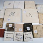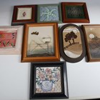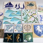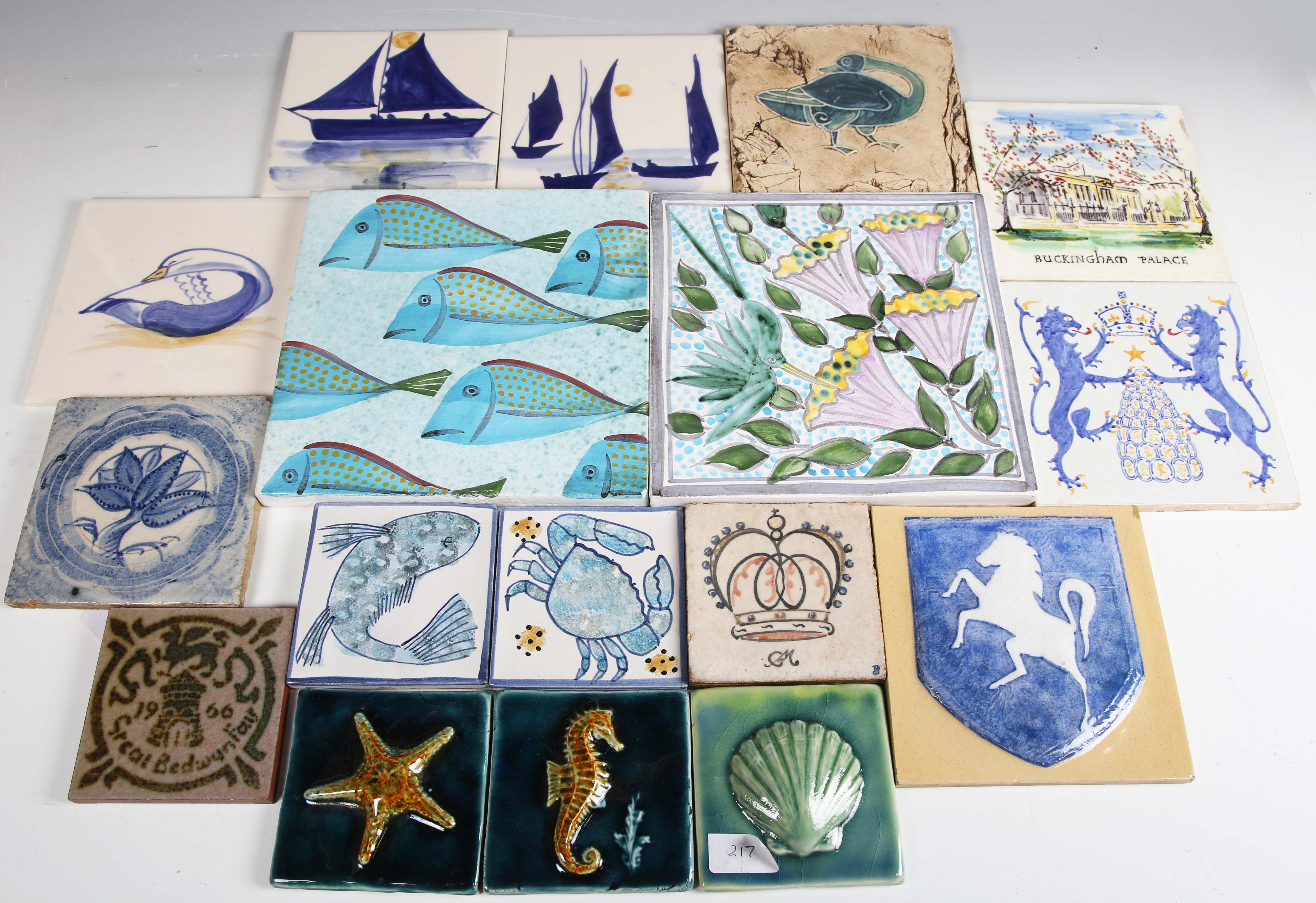 A small commemorative pottery tile, circa 1911, probably Waldo Lanchester, commemorating the coronation of King George and Queen Mary, 10cm square, a relief moulded and hand painted tile by Dunsmore depicting Invicta, circa 1933, designed and modelled by Polly Brace, 15.3cm square, a similar Dunsmore tile designed by Polly Brace, painted with an heraldic emblem, and another Dunsmore tile painted with a titled view of Buckingham Palace, 15.3cm square, together with a small group of later 20th century mainly studio pottery tiles, including two by Paul Gooderham, 1990s, incised with sunset views, both framed, largest 24cm by 29cm, a similar tile by Liz Boyle, three by The Buchlyvie Pottery, Stirling, Scotland, depicting a boat, designed and painted by Alison Borthwick, a swan and yachts, three by Royce Wood, two by Jason Shakleton and two by Andrew Fisher. Provenance: Blanchett Collection.