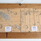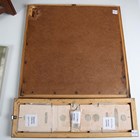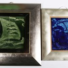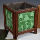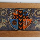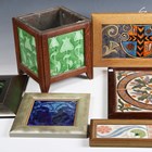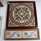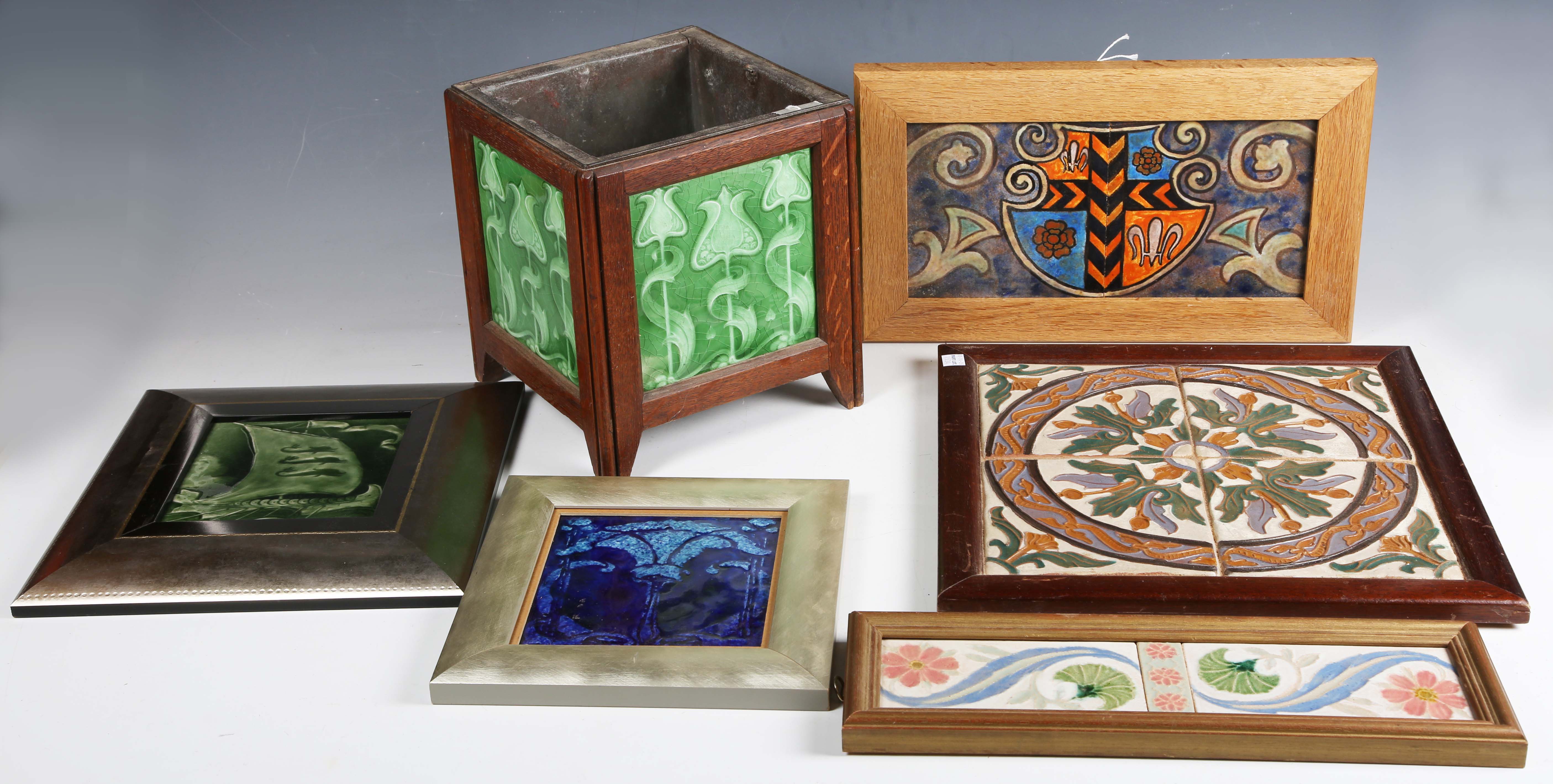 A four tile oak planter, early 20th century, of square shape, each face with an H & R Johnson green glazed tile with relief moulded Art Nouveau floral decoration, fitted with a metal liner, height 23.5cm, together with a framed Sherwin & Cotton green glazed tile relief moulded with a Viking ship, a Marsden Tile Co. stencilled slip blue glazed tile decorated with an Art Nouveau flower, framed, a two tile panel depicting an Arts & Crafts style coat of arms, framed, another four tile panel, framed, 34.5cm square, and a Medmenham Pottery three tile panel designed by Conrad Dressler, framed, 36.5cm by 11.3cm. Provenance: Blanchett Collection.