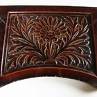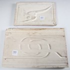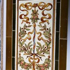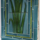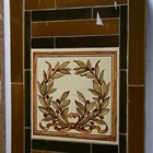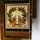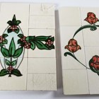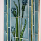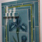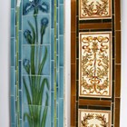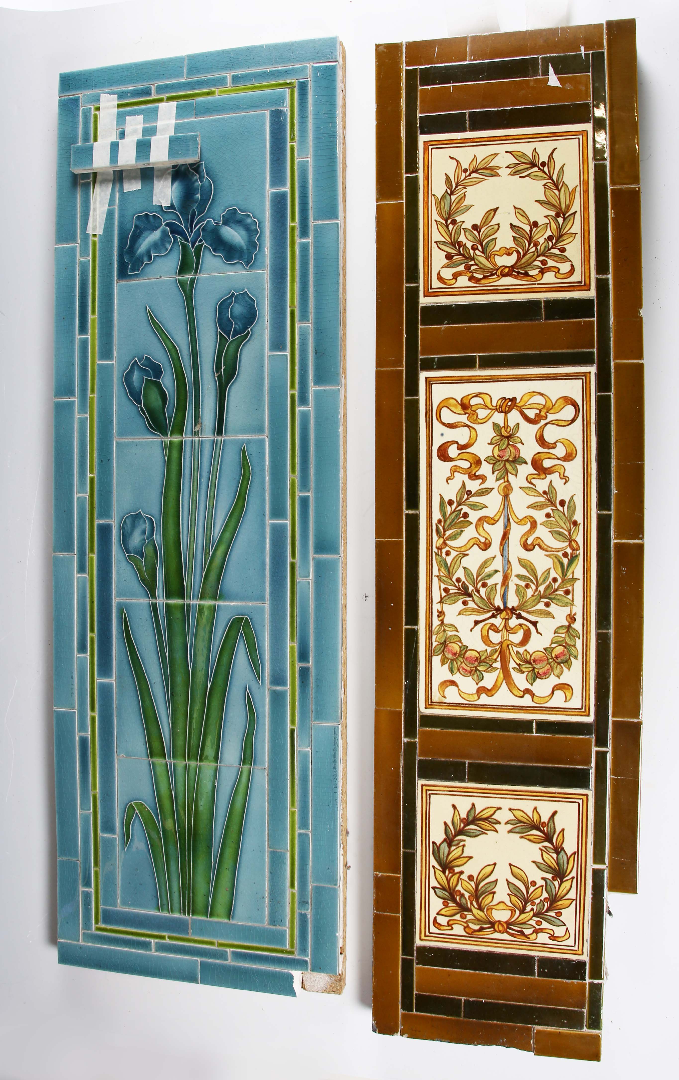 An Art Nouveau tile panel, early 20th century, of rectangular shape formed from a combination of mounted square tiles and rectangular spacers, decorated with blue iris flowers and green leaves within a thin green frame against a blue ground, 91cm long by 29cm, a similar tile panel with Arts & Crafts style foliate wreath and ribbon decoration against an olive green ground, 92cm by 23cm, another with roses hung from a pink ribbon, a large Doulton brown glazed foliate moulded fireplace hood tile section of curved rectangular shape, specifically for the Empire No. 2 fireplace, 51cm by 40.5cm, two other smaller tile panels with Art Nouveau flower decoration against a cream ground and two further red glazed tile panels (some faults). Provenance: Blanchett Collection.