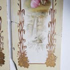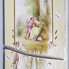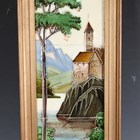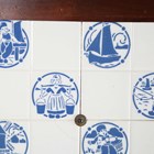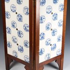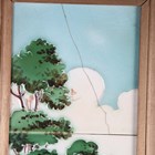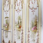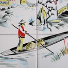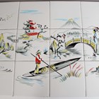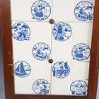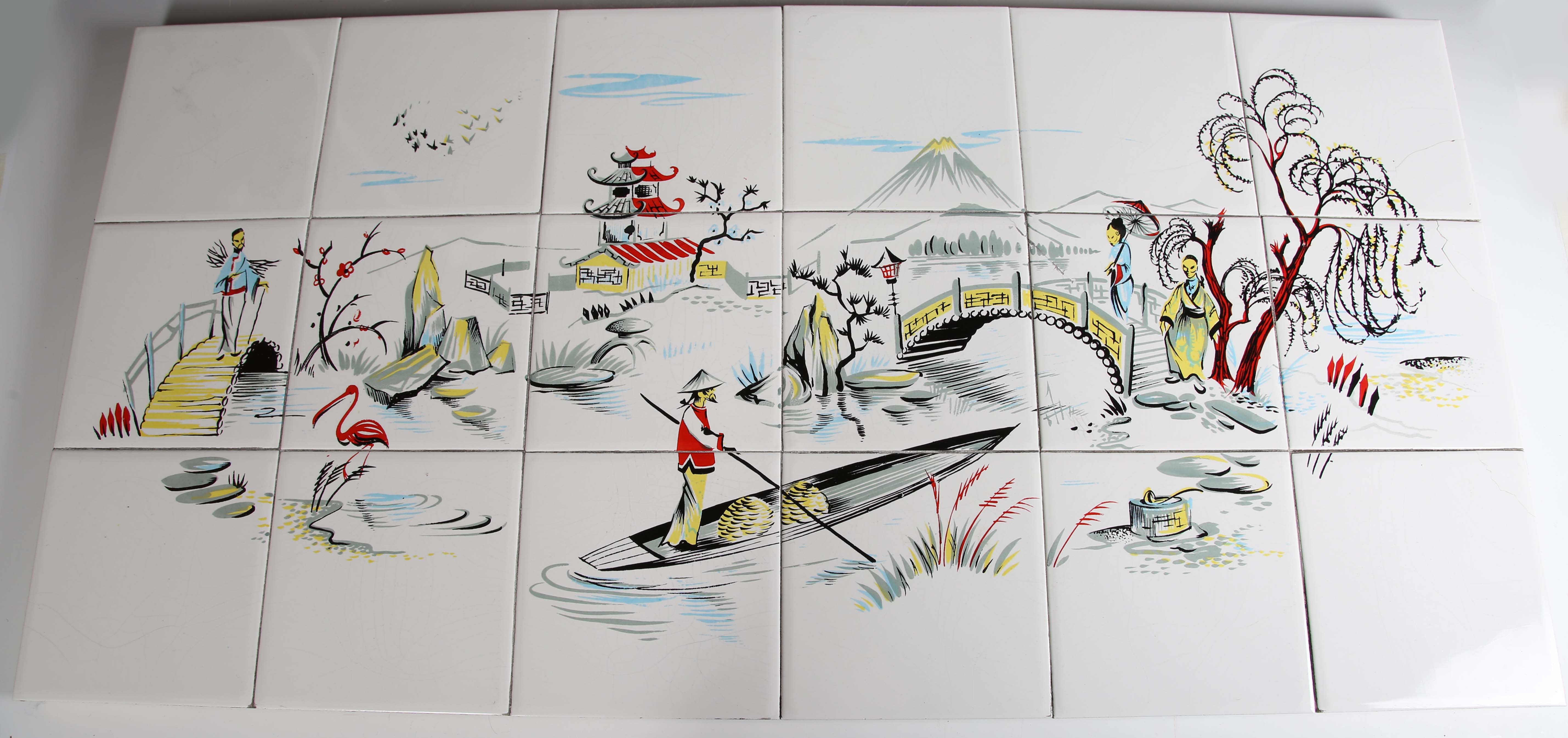 An eighteen tile panel printed with a chinoiserie landscape, mid-20th century, mounted on a board, 92cm by 46cm, a six tile panel, probably Poole Pottery, depicting an Art Nouveau lady with peacocks, framed, 54cm by 38.5cm, a large Copeland rectangular tile painted with a house by a river, impressed mark to reverse, 97.5cm by 26cm, a two-section wooden framed folding fire screen mounted with sixteen quartered Belgian tiles by Gilliot Frères, circa 1915, decorated in blue with Dutch scenes and figures, height 91cm, three large rectangular Copeland & Garrett Watteau style tiles, circa 1840, printed and painted with romantic couples in period dress by follies and waterfalls beneath foliate wreaths and gilt scrollwork, each 89.5cm by 20.5cm, and two other framed tile panels (some faults). Provenance: Blanchett Collection.