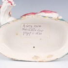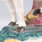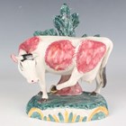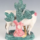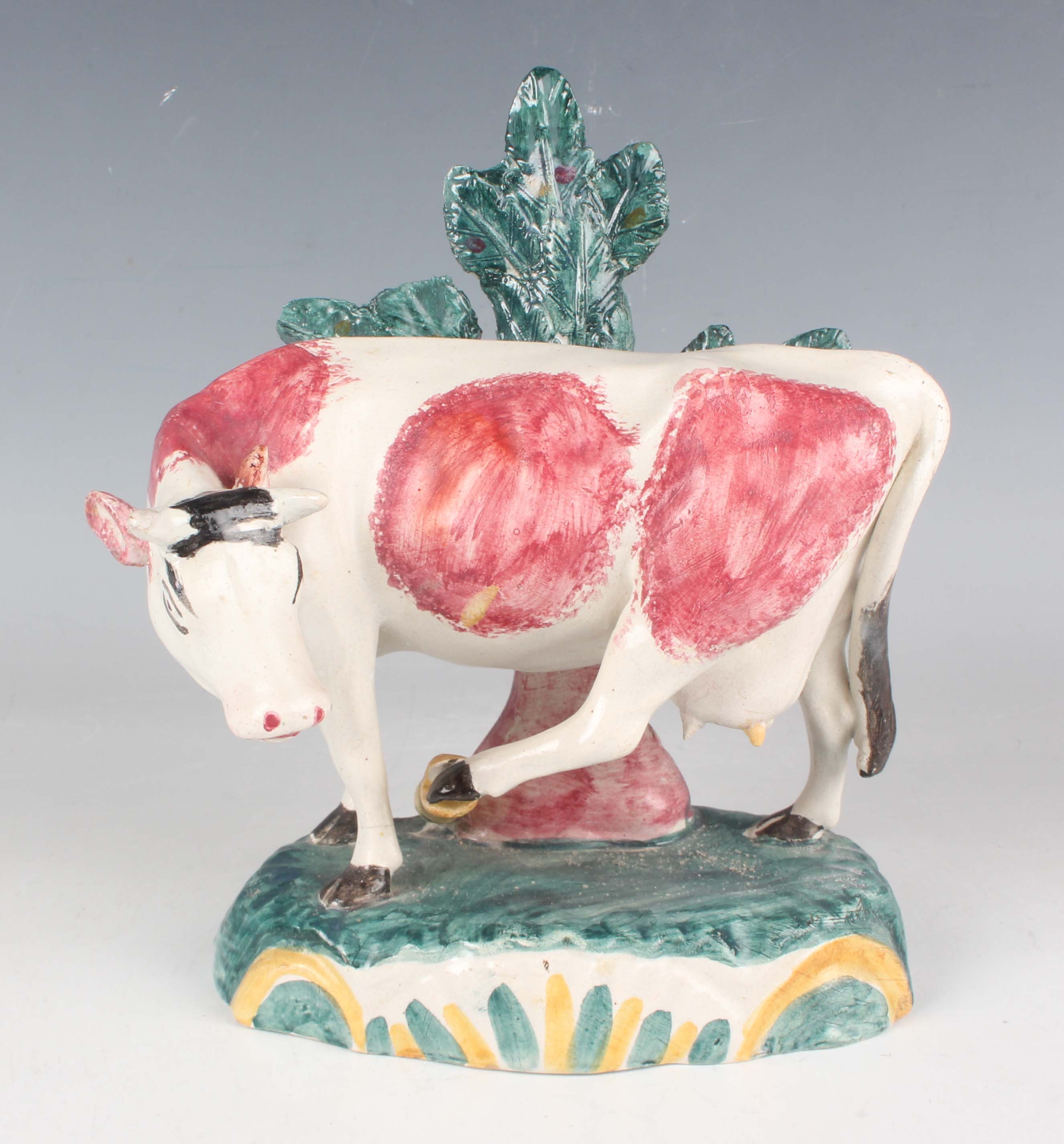 A Staffordshire pottery bocage figure of a cow and snake, early 19th century, the cow modelled with raspberry patches, standing with a snake attacking its left hind leg, on a green and yellow decorated rainbow type moulded base, height 17cm (restoration).