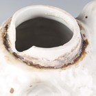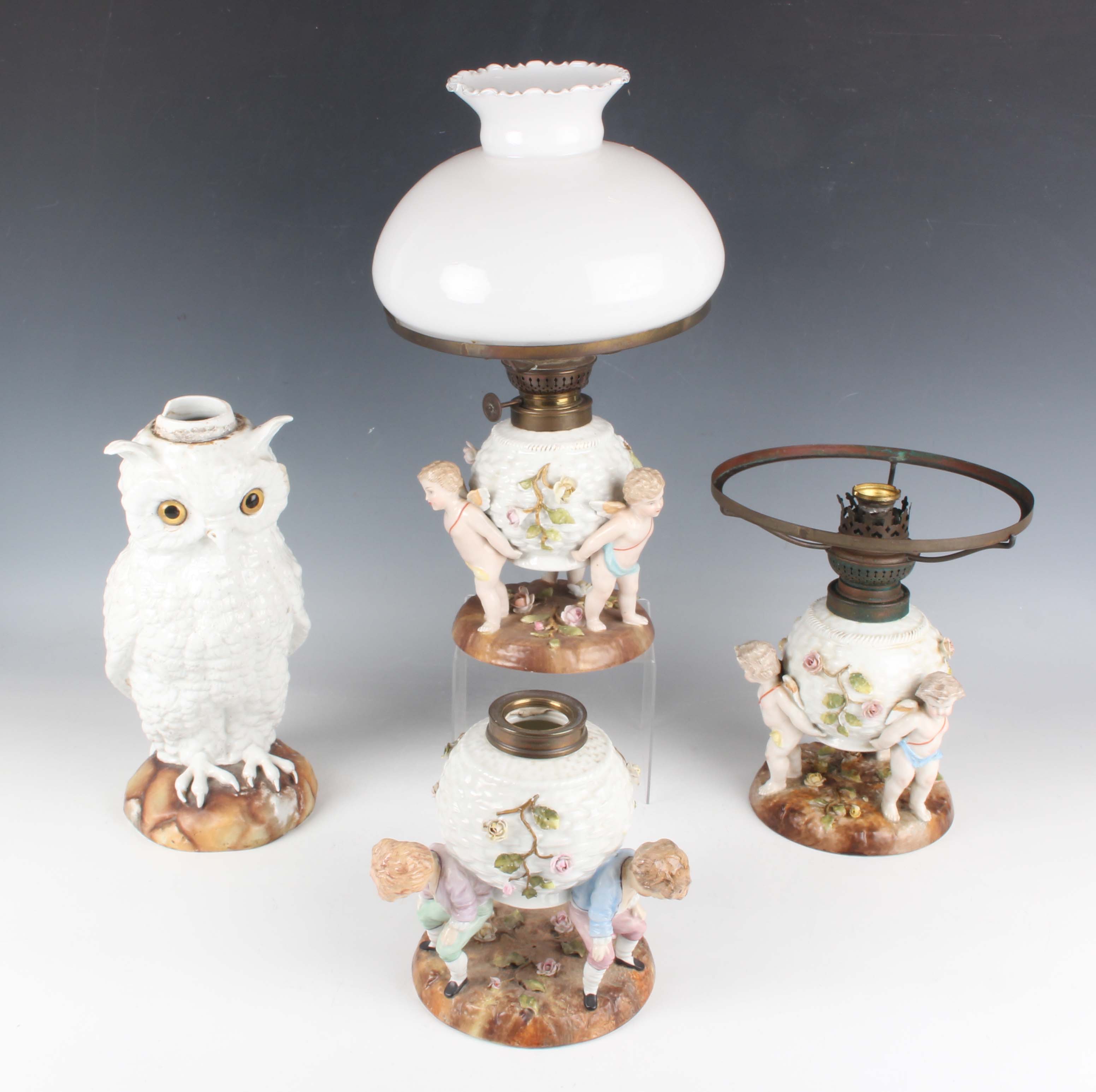 A pair of Sitzendorf porcelain oil lamps, late 19th century, each modelled with three cherubs supporting a flower encrusted wicker moulded reservoir, underglaze blue mark to bases, height 21.5cm, one with glass shade, together with a similar Sitzendorf oil lamp, height 16cm, and a porcelain oil lamp base modelled in the form of an owl, unmarked height 27cm (faults).