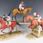 Two Capodimonte porcelain figures of racehorses and jockeys, 20th century, by Mariani, each with oval base, printed mark to bases, heights 24cm and 26cm, together with a Hamilton Collection resin figure of 'On Parade', sculpted by David Geenty, height 25.5cm (minor faults).