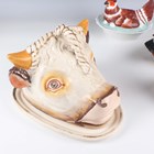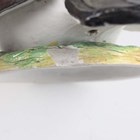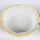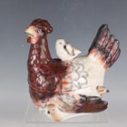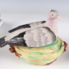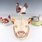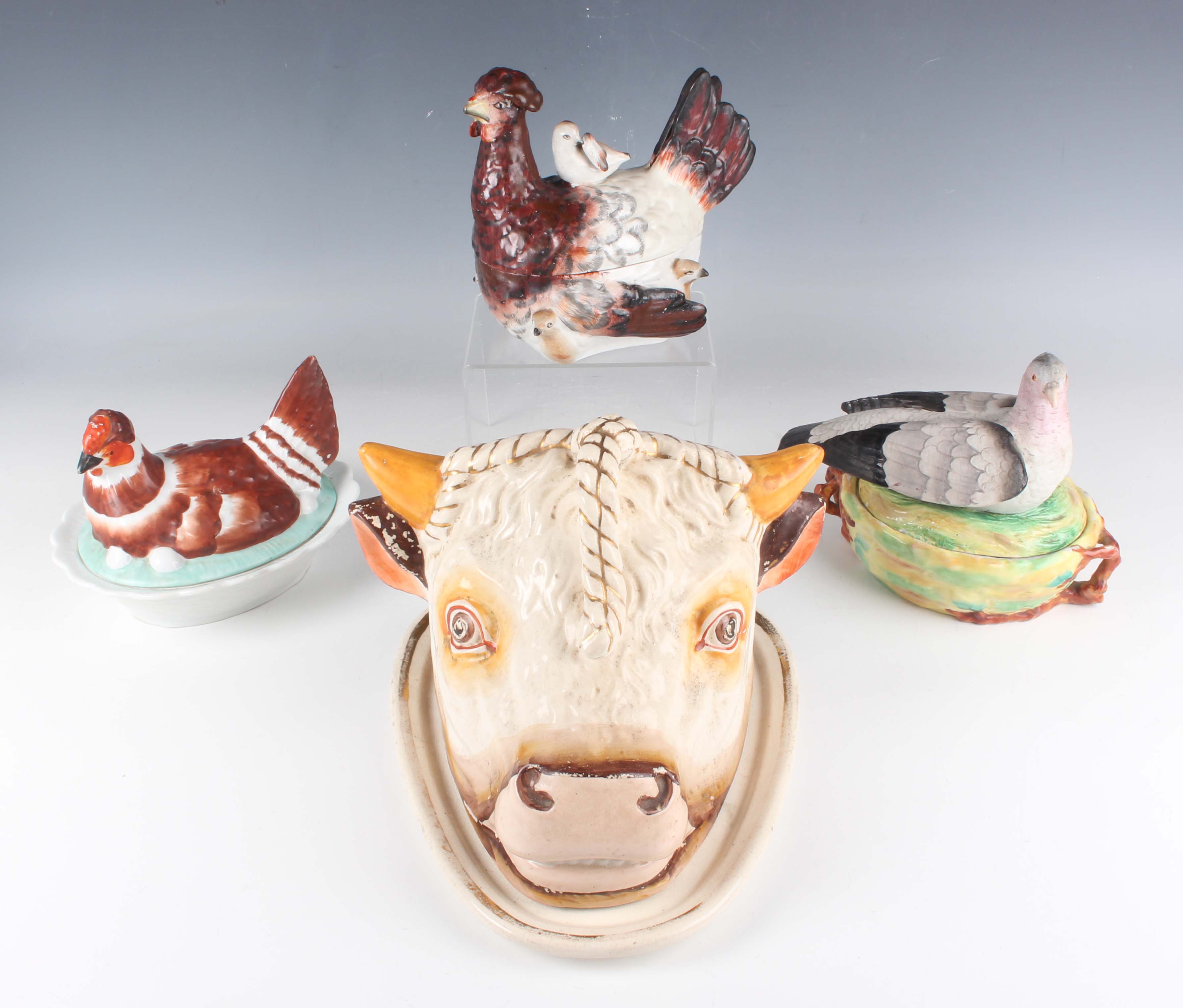 A Staffordshire pottery tureen and cover, mid to late 19th century, modelled as a nesting hen with brown plumage detail and seven chicks, height 16.5cm (restoration), together with a Continental porcelain hen tureen and cover, height 12cm, a porcelain pigeon and nest tureen and cover, height 15.4cm (some faults), and a pottery cheese dish and cover in the form of a bull's head, height 17.5cm.