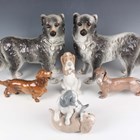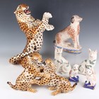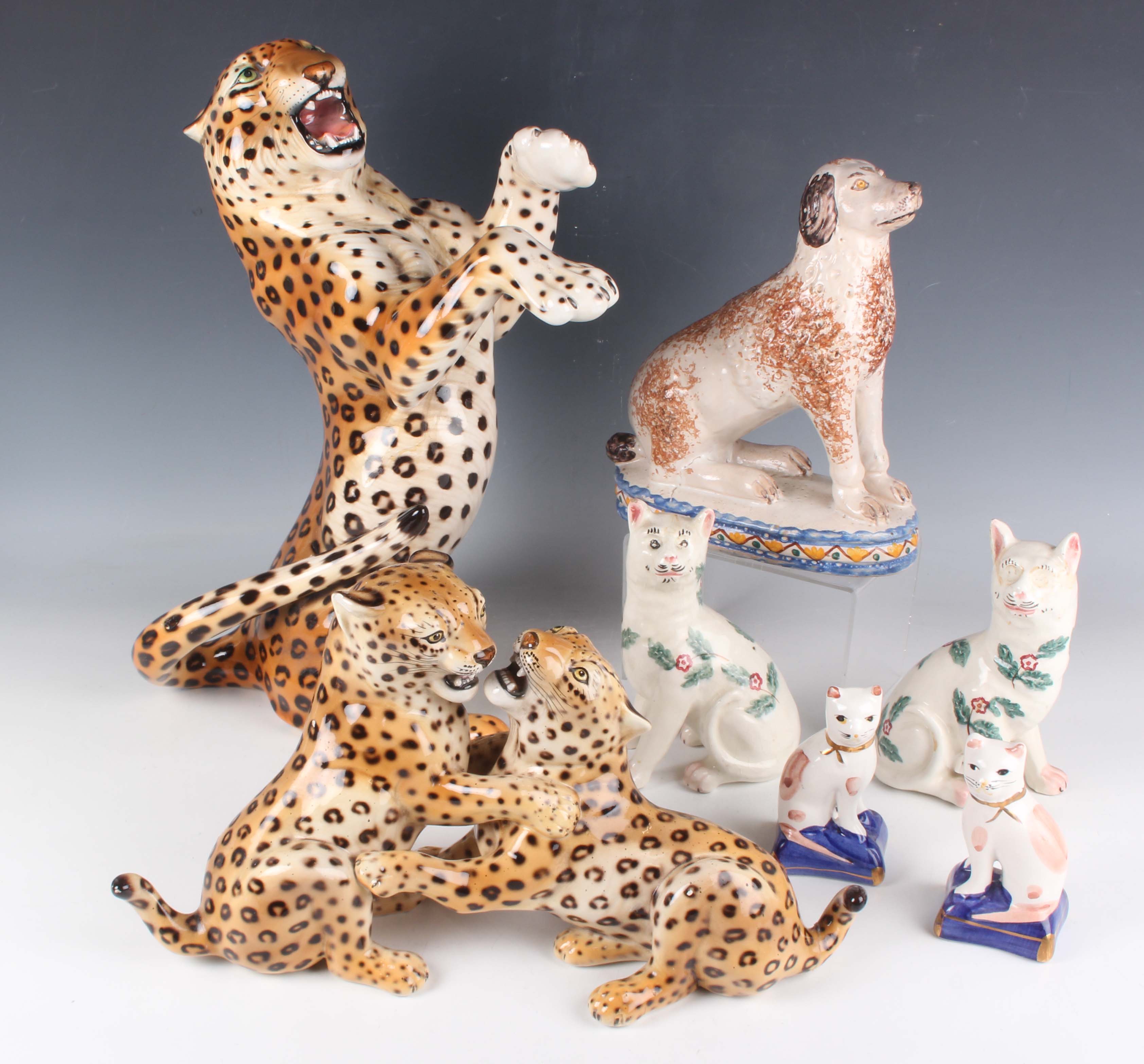 An Italian pottery figure group of two playful leopard cubs, by Ronzan, second half 20th century, painted factory mark to base, length 34.5cm (chip to one ear), a larger Italian Ronzan pottery figure of a leopard, height 38.5cm, and a collection of other porcelain and pottery figures of dogs and cats (some faults).