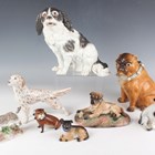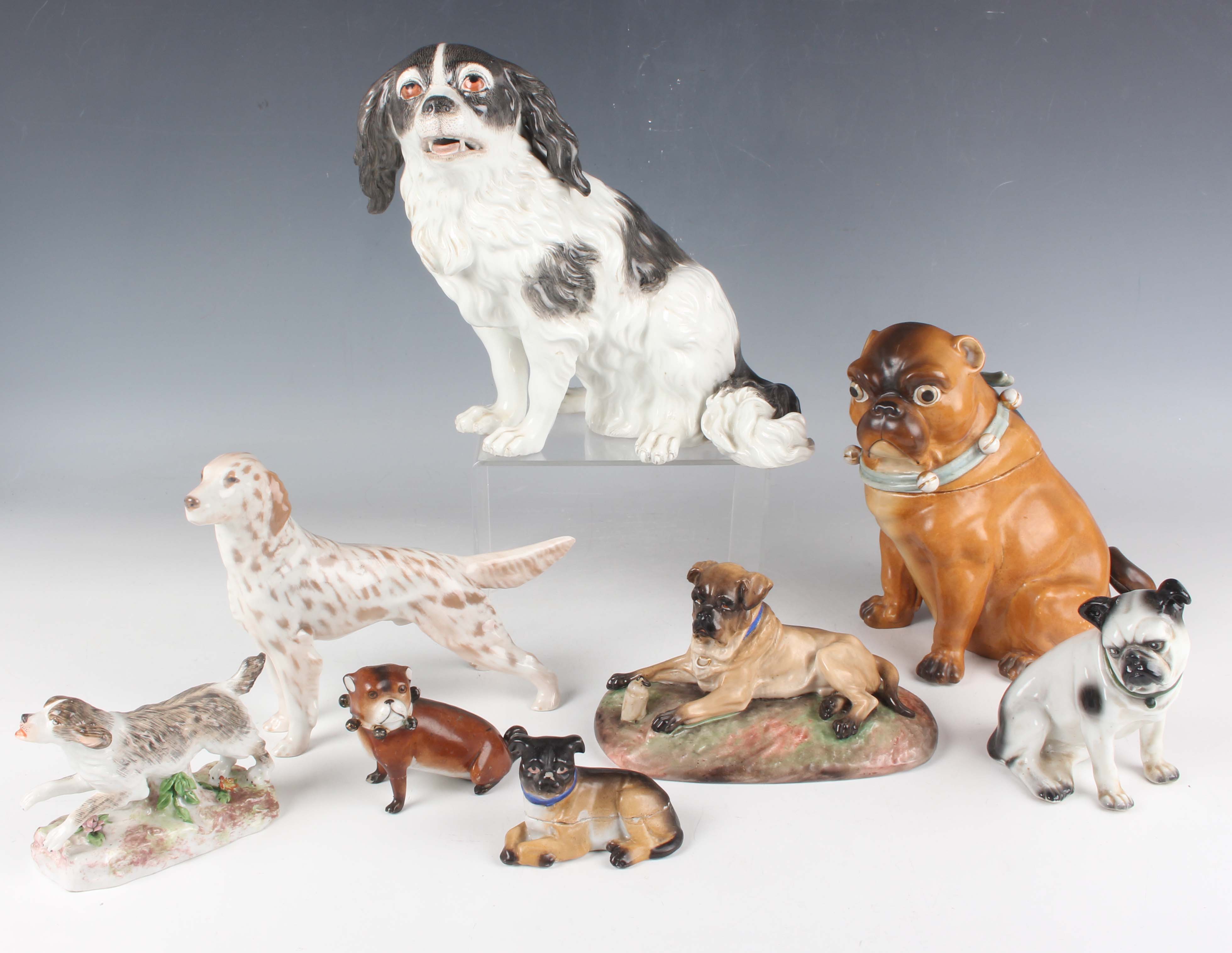 A Continental porcelain Meissen style model of a seated Bolognese dog, early 20th century, unmarked, height 20.4cm, together with a Sitzendorf porcelain model of a recumbent Bullmastiff, height 8.5cm, a Continental porcelain jar and cover in the form of a pug, height 16.8cm, and five other porcelain dogs (some faults).