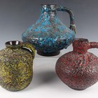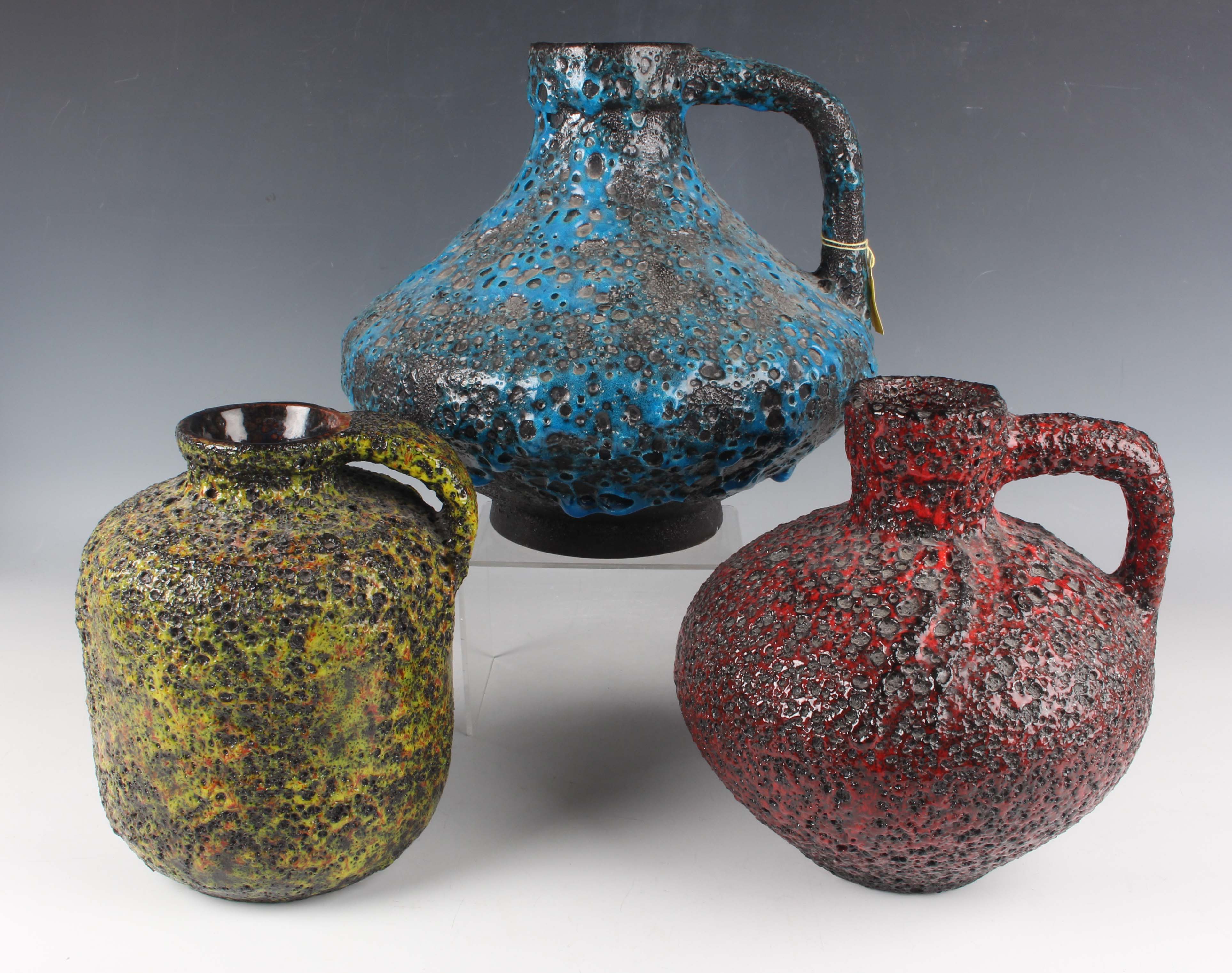 Three pieces of West German Fat Lava glazed pottery, 1960s/70s, comprising a single handled jug of UFO shape by Jopeko with erupted blue glaze on a black ground, moulded numerals 47/25 to base, height 27cm, a single handled jug, probably by Silberdistel, with erupted red glaze on a black ground, incised numerals to base 306/23, height 21cm, and a single handled jug, probably Kreutz, with erupted lime green and red glaze on a black ground, moulded numerals 211 to base, height 20cm.