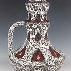 A large West German pottery single handled floor vase jug, circa 1970, probably Jopeko, shape No. 106 50, the erupted black glazed body moulded with red glazed geometric shapes outlined in black lava against a white lava glazed ground, moulded marks to base, height 49cm.