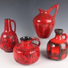 Four pieces of West German pottery, 1960s/70s, comprising two Gräflich Ortenburg single handled jugs, covered in erupted red lava type glazes against a black ground, shape Nos. 619 and 605/1(?), moulded shield mark and numerals to bases, tallest 24cm high, an Emons & Söhne Keramik jug with mottled red glaze and high swept handle, indistinct moulded marks to base, height 23cm, and a Ruscha red glazed jug with matt black lava glaze pattern, designed by Otto Gerharz, shape No. 333, height 18cm.