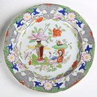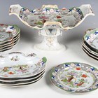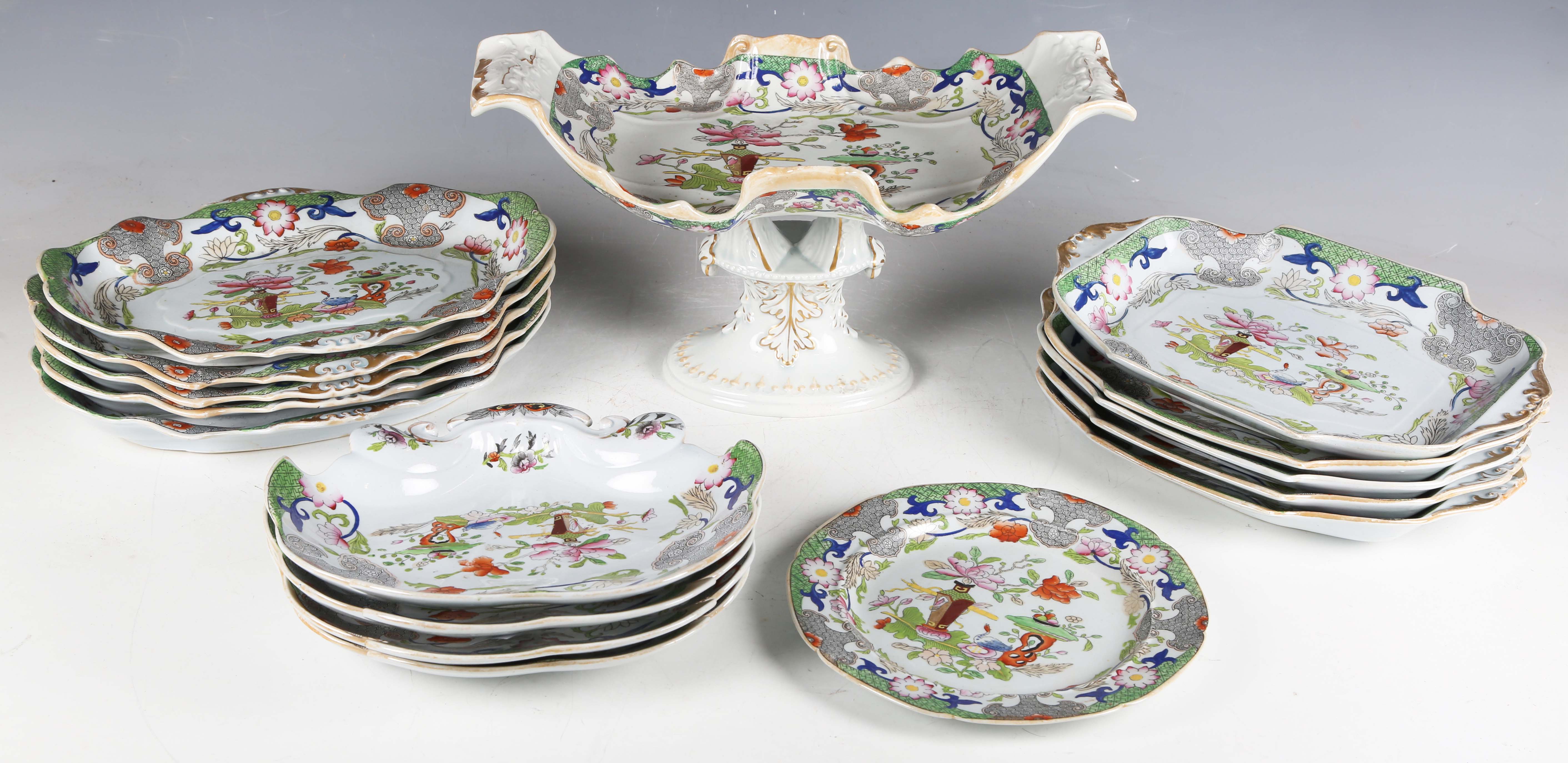 A Mason's Patent Ironstone China part dessert service, circa 1813-20, enamelled and gilt with the Table and Flower-pot pattern in Chinese taste, comprising a comport, five rectangular dishes, length 27cm, five oval dishes, length 27.5cm, four shell shaped dishes, length 23cm, and a plate, diameter 20cm, impressed and printed marks to bases (minor faults).