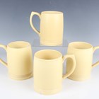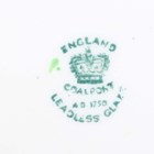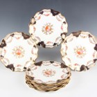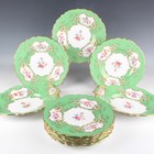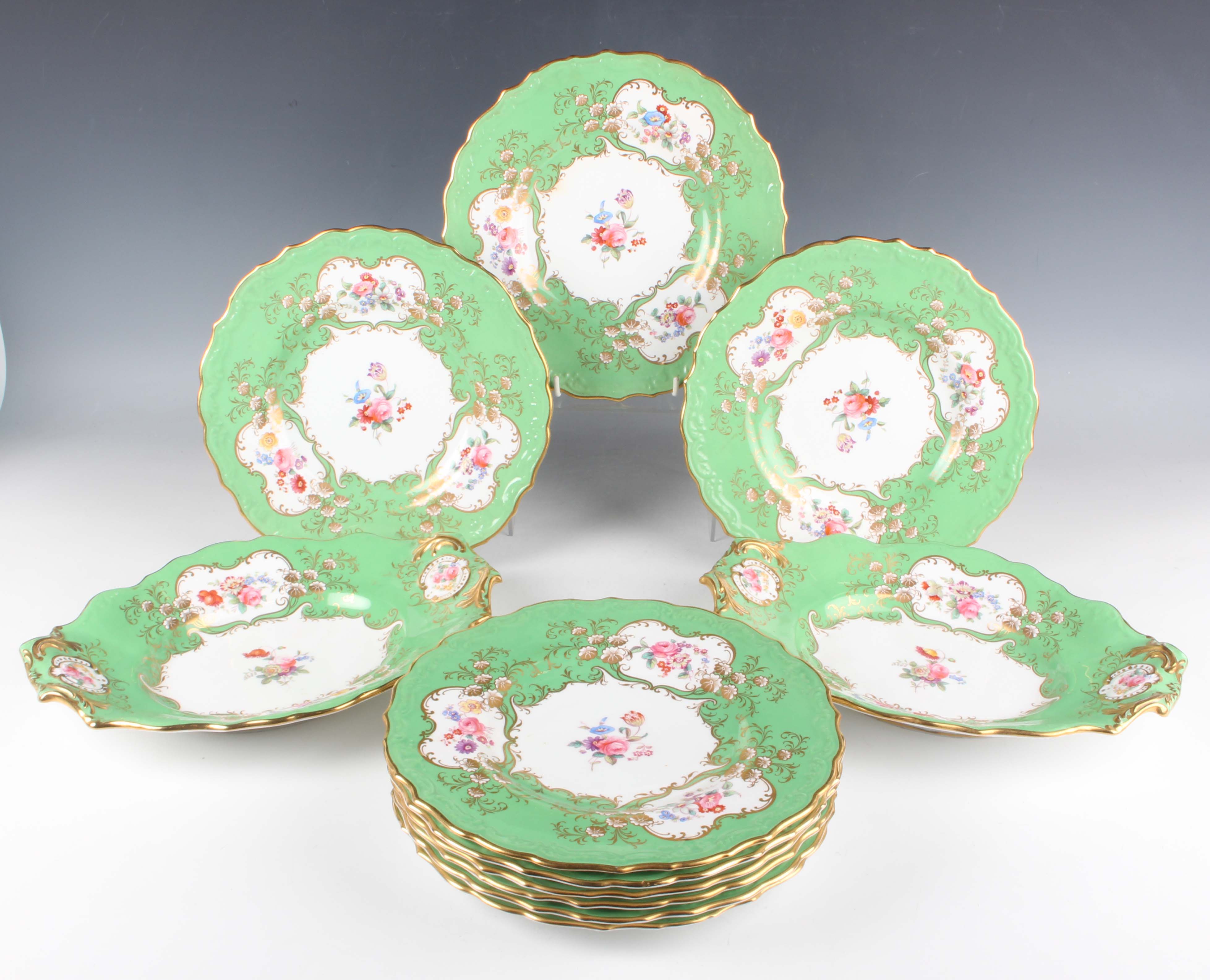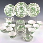 A Spode Copeland's China Rutland design part dessert service, first half 20th century, decorated with floral panels within gilt foliate scroll frames against an apple green ground, comprising nine plates, diameter 23.5cm, and two oval dishes, together with nine Wedgwood dessert plates with scalloped rims, gilt and enamelled with floral garlands and medallions within cobalt blue panels gilt with a scale pattern, diameter 21cm, a Coalport Green Dragon pattern part service, including nine teacups and saucers, nine small plates, milk jug and sugar bowl, and four Wedgwood Keith Murray designed straw yellow colour mugs, height 12.3cm (faults).