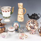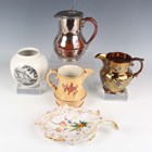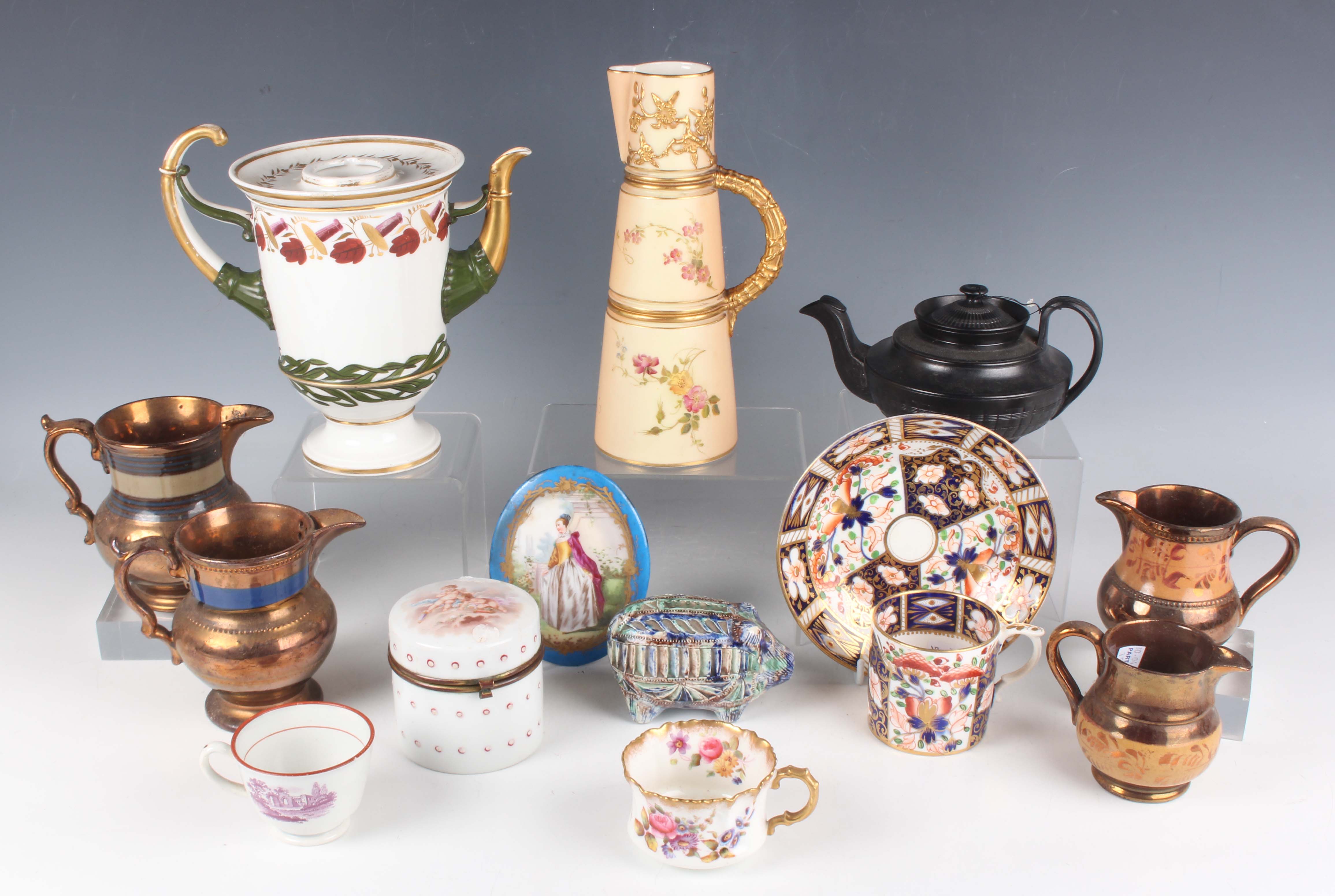 A mixed group of British and Continental pottery and porcelain, 19th and 20th century, including a Royal Worcester blush ivory claret jug ewer, shape No. 1047, dated 1903, height 20cm, a Dutch carved Frisian pottery pig money bank, length 9.5cm, a Continental porcelain oval plaque in Sèvres style decorated with a lady in period dress within gilt framing against a bleu céleste ground, height 11cm, a matched Derby Imari Japan pattern can and saucer, black basalt teapot and cover and a group of copper lustre wares (faults).