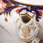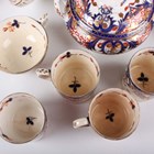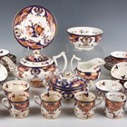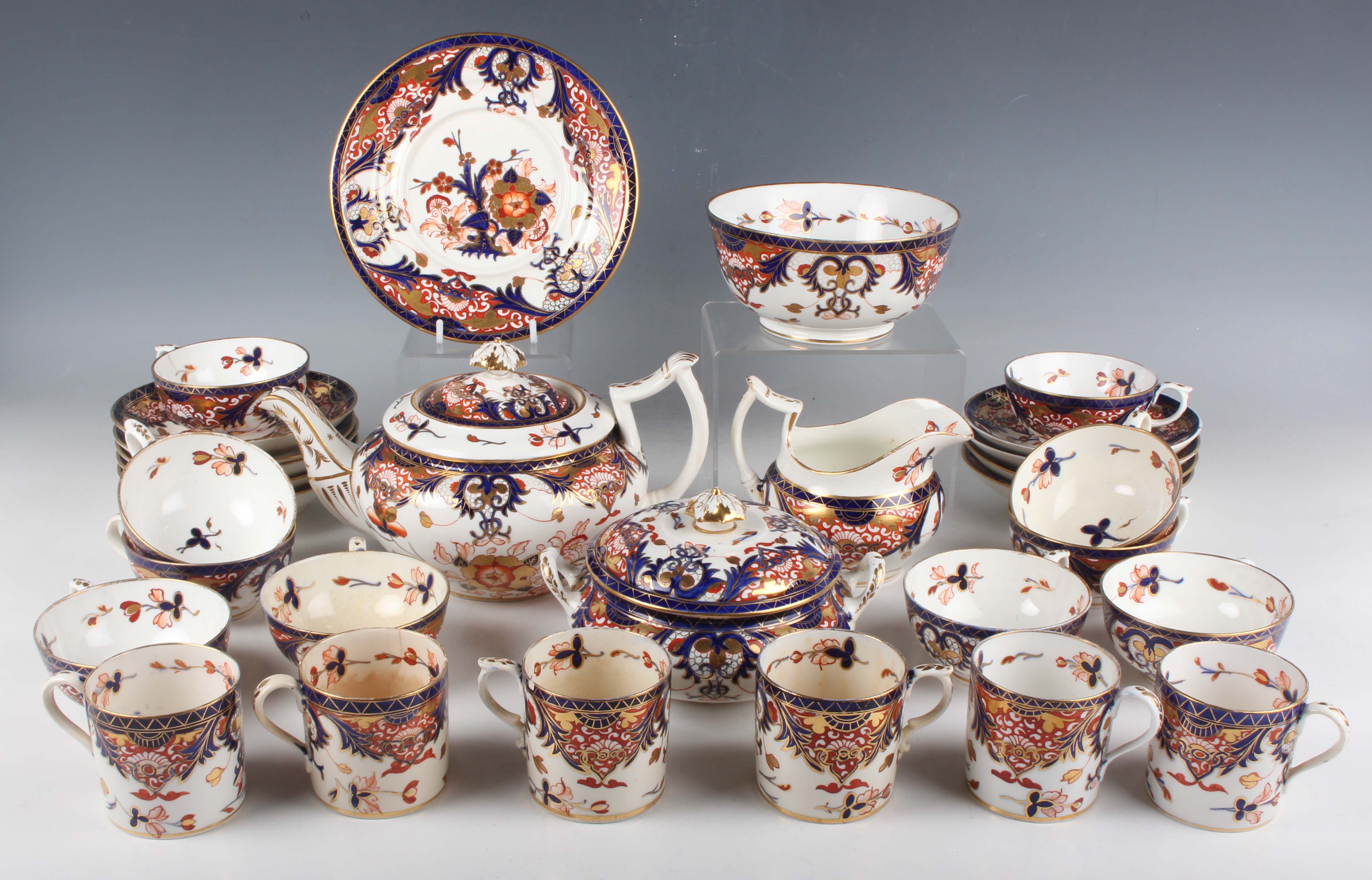 A matched Derby porcelain Imari decorated Japan pattern part service, 19th century, comprising teapot, cover and circular stand, slop bowl, jug, ten teacups, six coffee cans, two-handled sugar bowl and cover and nine saucers, various red printed and painted marks to bases with pattern No. 29 (faults).