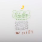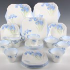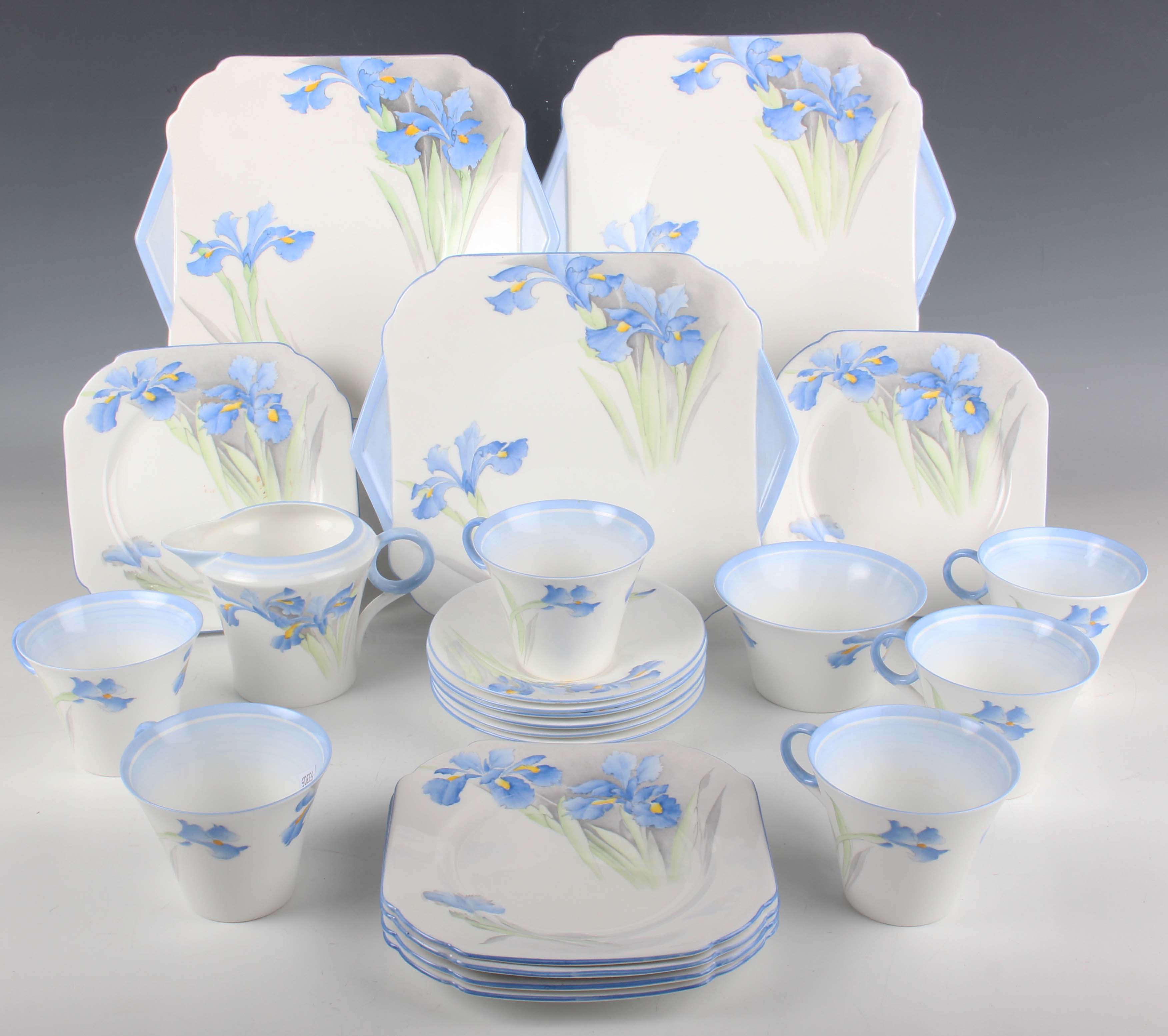 A Shelley Regent shape part service, pattern No. W12384, decorated with blue iris, comprising six cups and saucers, six square shaped tea plates, milk jug, sugar bowl and three two-handled square shaped plates (minor faults).