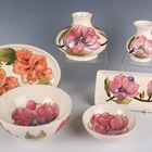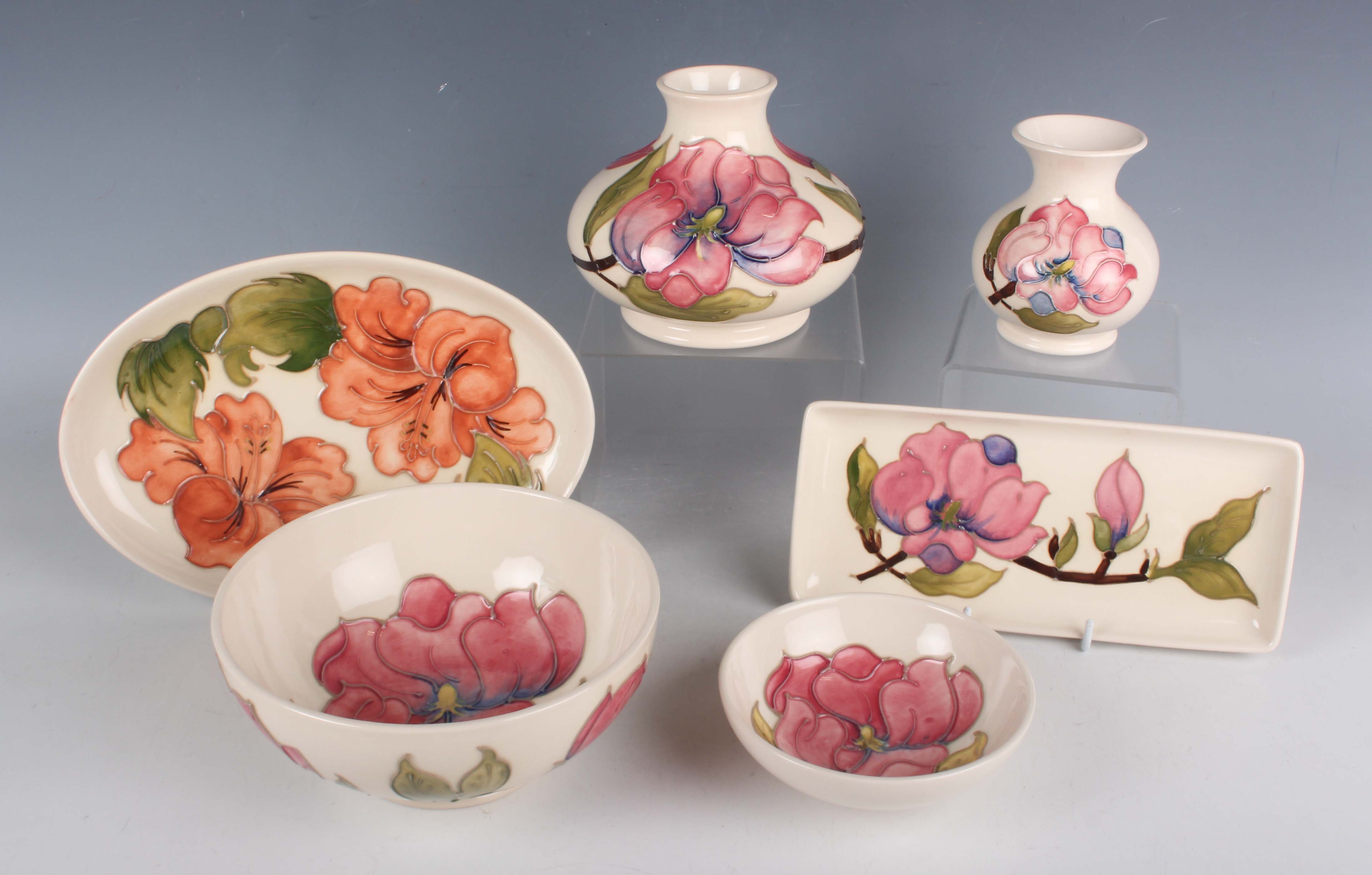 Five pieces of Moorcroft Pottery decorated in the Pink Magnolia pattern against an ivory ground, circa 1980, comprising two vases, 11cm and 9cm high, two circular bowls, 16cm and 11.5cm diameter, and a rectangular tray, length 20.8cm, together with a Coral Hibiscus pattern oval tray, length 23cm, various impressed and painted marks to bases.