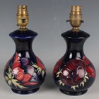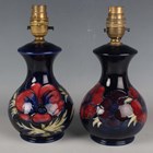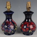 A matched pair of Moorcroft Pottery Anemone pattern lamp bases, second half 20th century, with cobalt blue grounds, impressed and painted marks to bases, height to top of pottery 16cm.