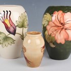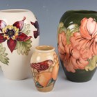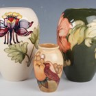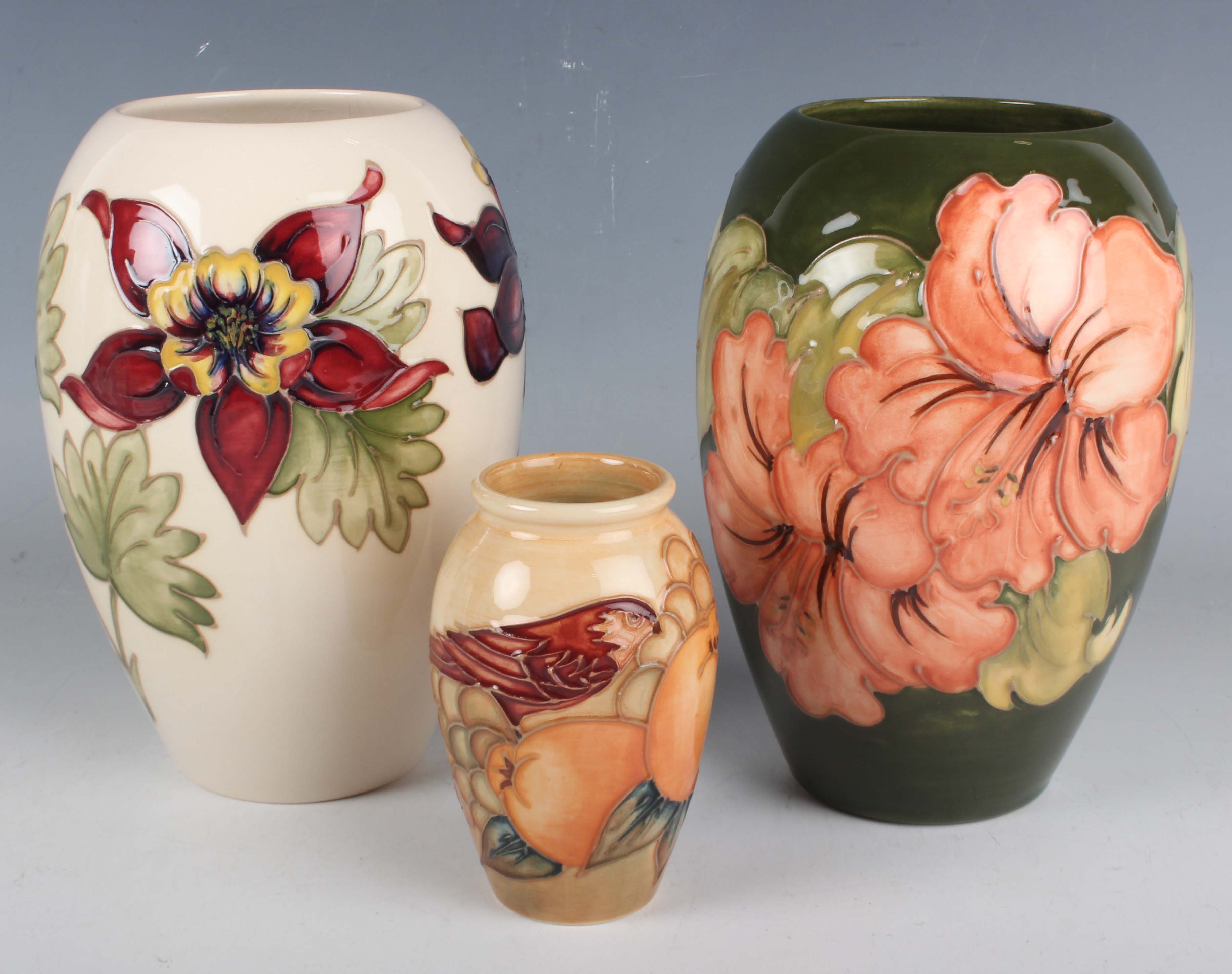 Three pieces of Moorcroft Pottery, second half 20th century, comprising a Finches pattern vase, designed by Sally Tuffin, height 10.5cm, a Coral Hibiscus vase with green ground, height 18cm, and a Columbine vase with ivory ground, height 18cm, impressed and painted marks to bases.
