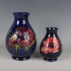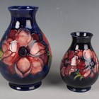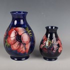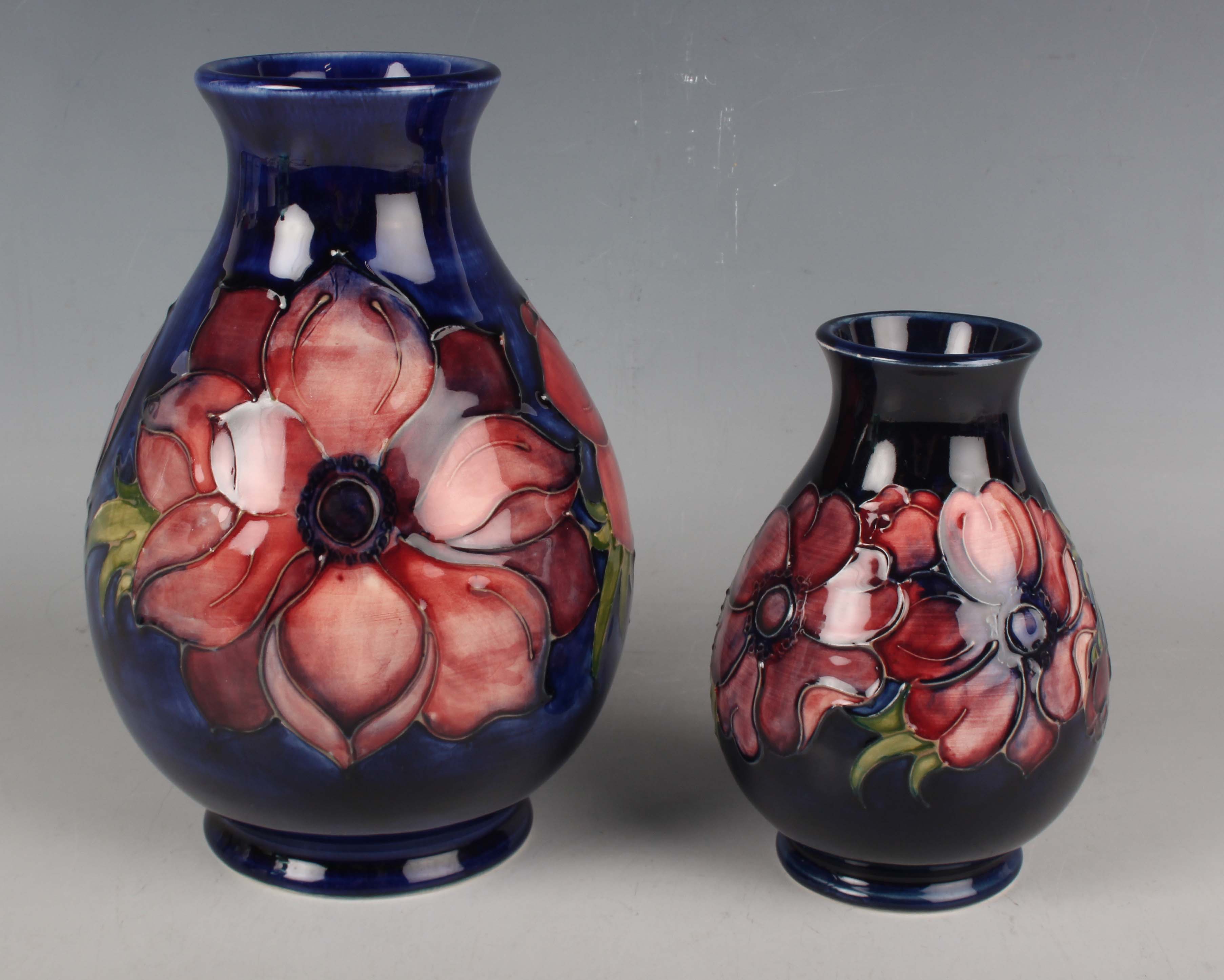 Two Moorcroft Pottery cobalt blue ground Anemone pattern vases, circa 1980, 19.5cm and 13.5cm high, impressed and painted marks to bases.