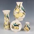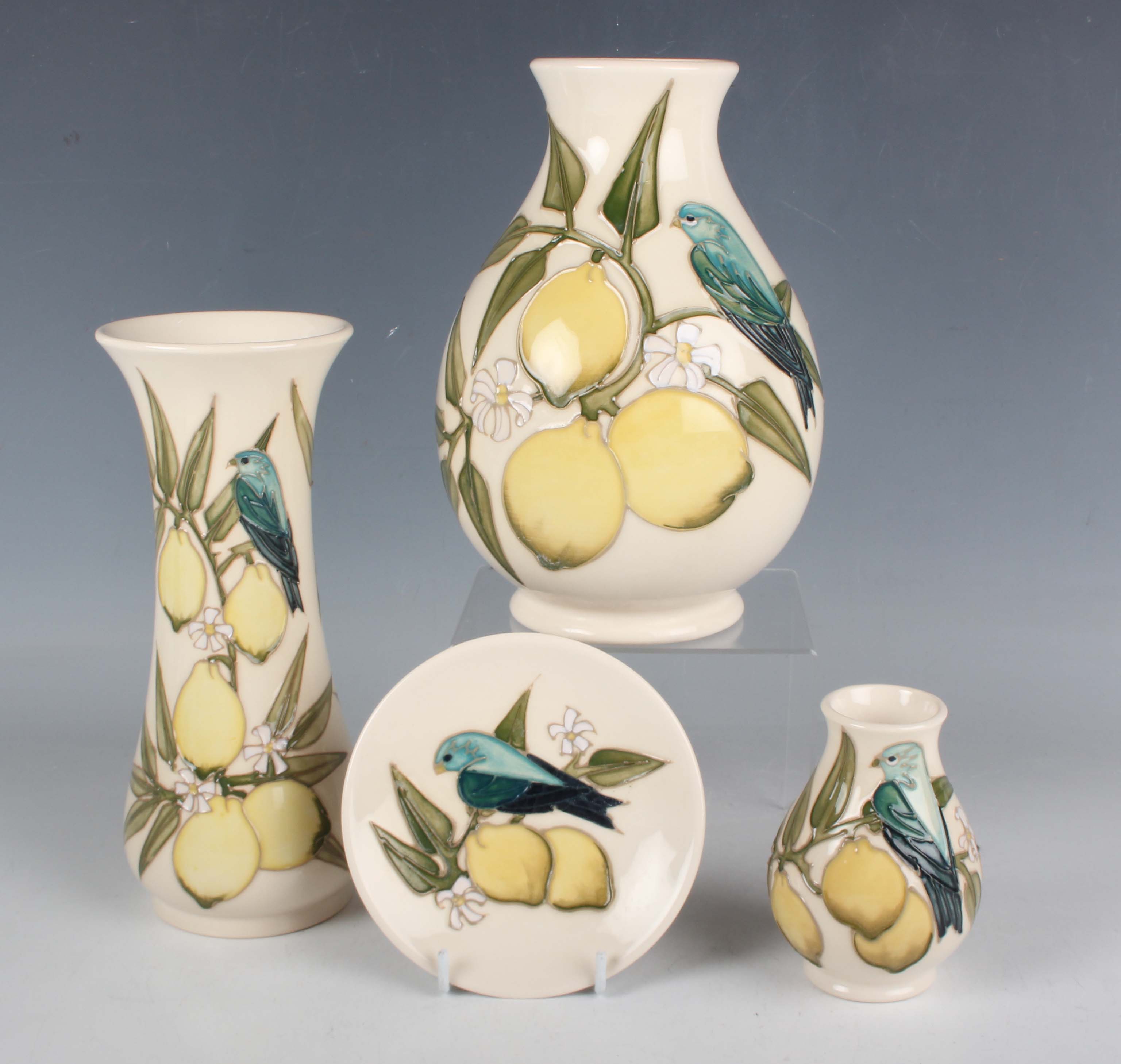 Four pieces of Moorcroft Pottery decorated in the Finches on Lemons pattern, circa 1990, designed by Sally Tuffin, comprising three vases, 20.5cm, 19cm and 9.5cm high, and a circular pin dish, diameter 12cm, various impressed and painted marks to bases.