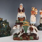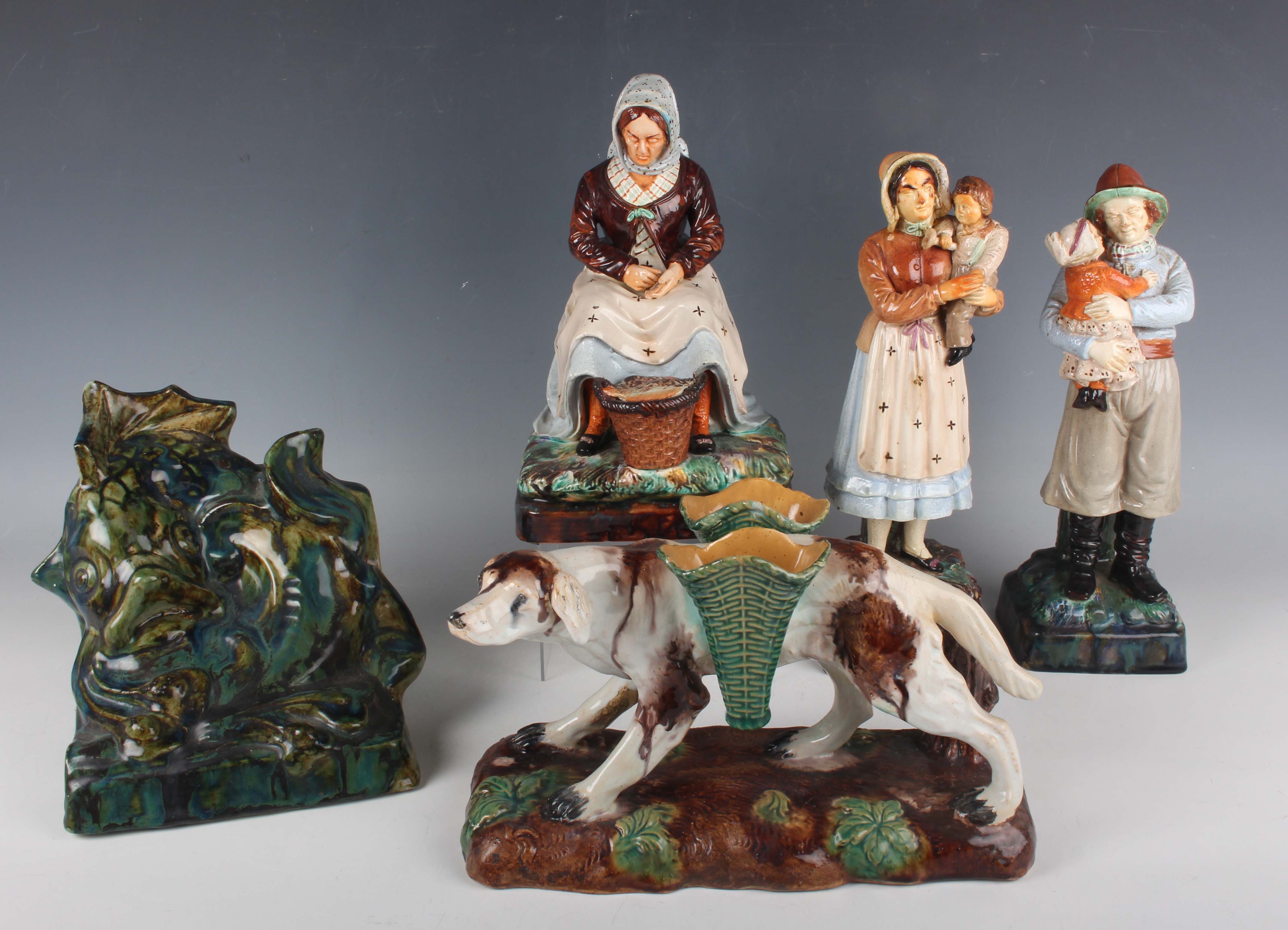 Three Continental pottery figures, late 19th century, probably Belgian or Northern French, two depicting a man and woman each holding a child, heights 28cm and 27cm, the third a seated woman fish vendor, height 24cm, each raised on a square mottled glaze base, Wittmann & Roth of London importers marks to bases, together with a Continental majolica model of a hunting dog carrying two baskets on its back before a tree stump spill vase holder, unmarked, length 24cm, and a pottery bookend moulded as a fish covered in a streaked and mottled blue/green glaze, height 17cm (faults and repairs).