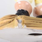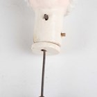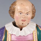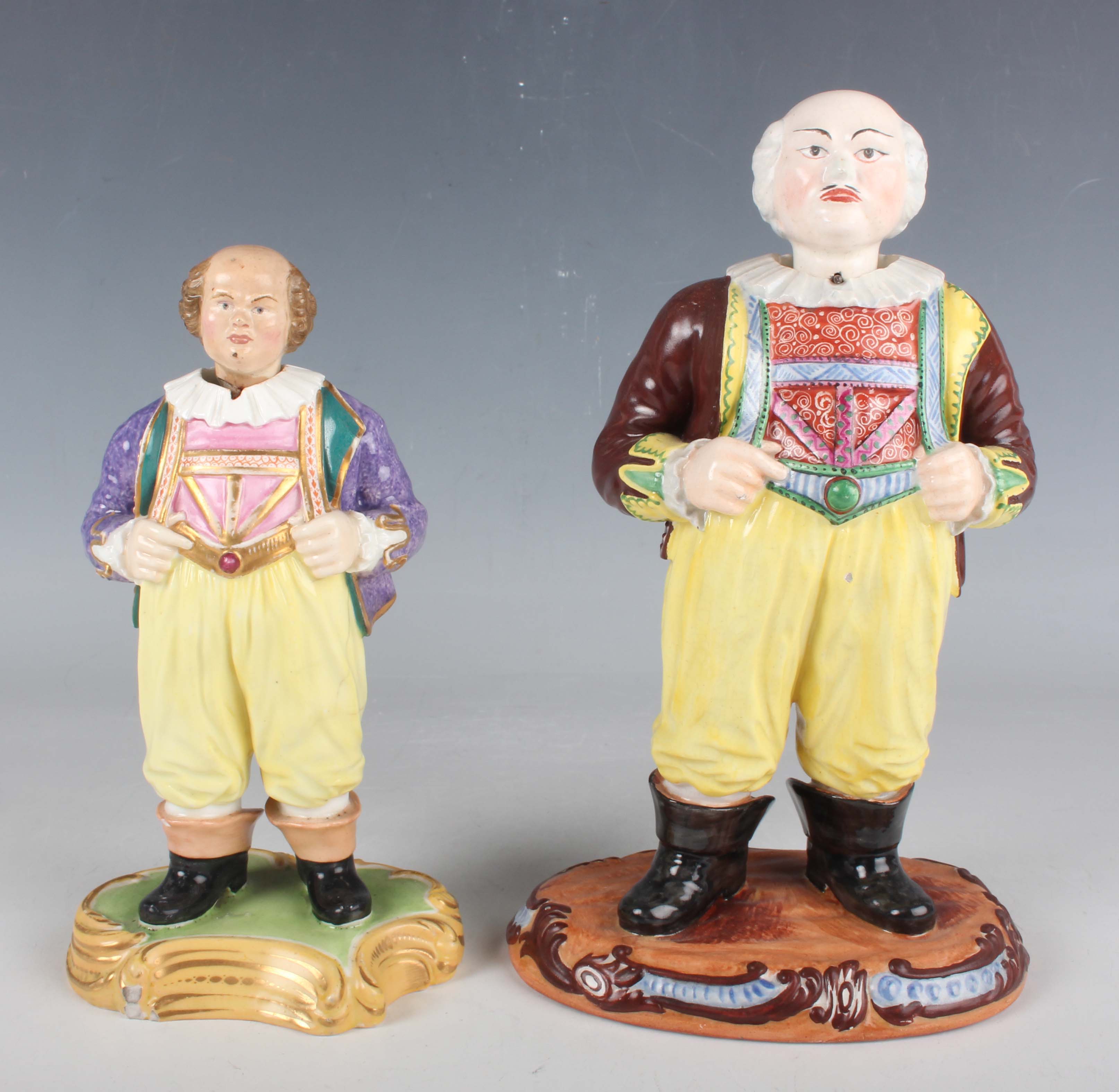 A Minton porcelain nodding head figure, mid-19th century, titled Easy Johnny but based on the original Kandler Meissen figure depicting the Court Jester Hofnarr Frohlich, gilt and polychrome enamelled, standing on a green glazed base with scroll moulded edges picked out in gilt and apricot, unmarked, height 18cm, together with a similar larger Staffordshire pottery nodding head figure, impressed 'SHAW' to the underside, height 22cm (faults and repairs).