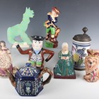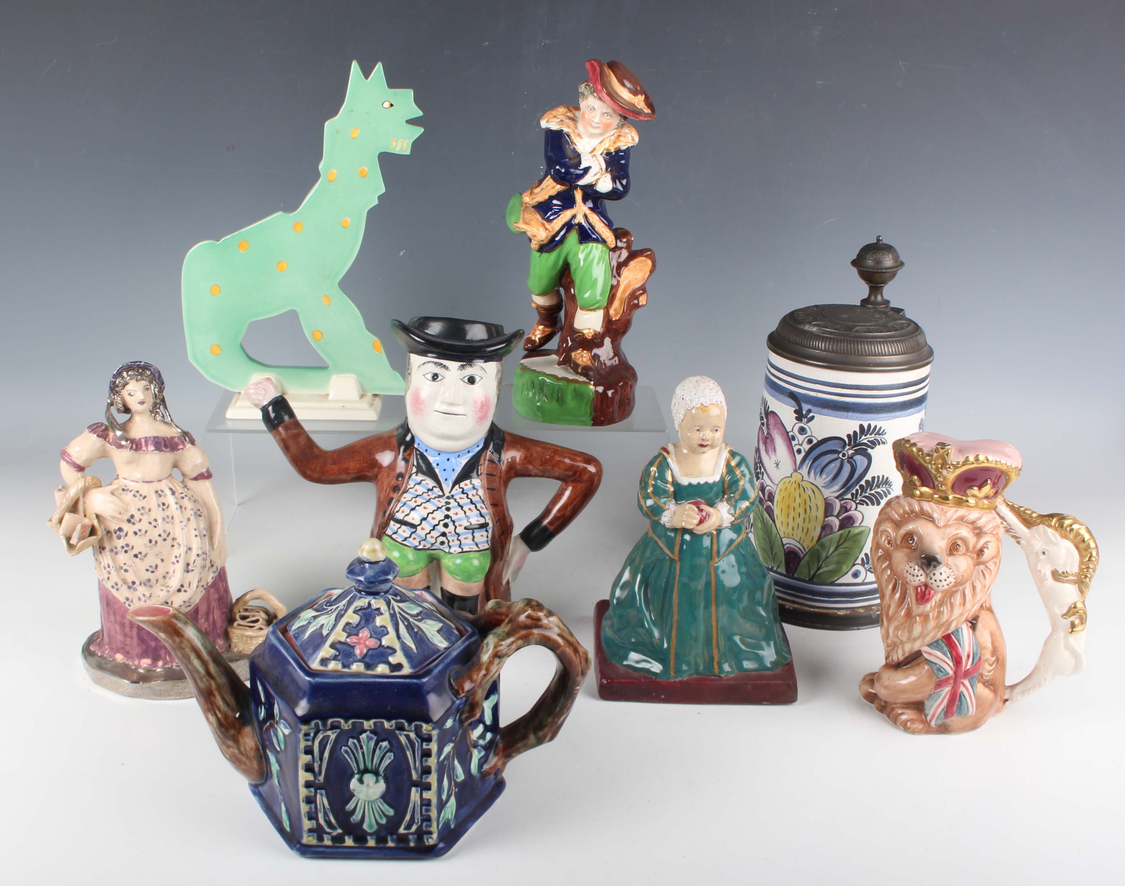 An unusual pottery Toby teapot with Portobello type sponged base and colours, mid to second half 19th century, modelled seated with brown frock coat and patterned waistcoat, unmarked, height 20.5cm, a pottery figure of a female street vendor with pink and silver lustre details, unmarked, height 18cm, a pottery figure of a young girl in a period green dress, raised on a rectangular burgundy glazed base, incised 'Maud Bateman' to underside, height 19.5cm, an English porcelain figure representing Winter, height 24.5cm, a faience stein with pewter mounts, height 24cm, a majolica teapot and cover of hexagonal shape, a Staffordshire Goldscheider Coronation lion and unicorn model, height 17cm, and a Coalport abstract animal ornament, height 24cm (faults and restoration).