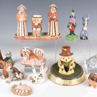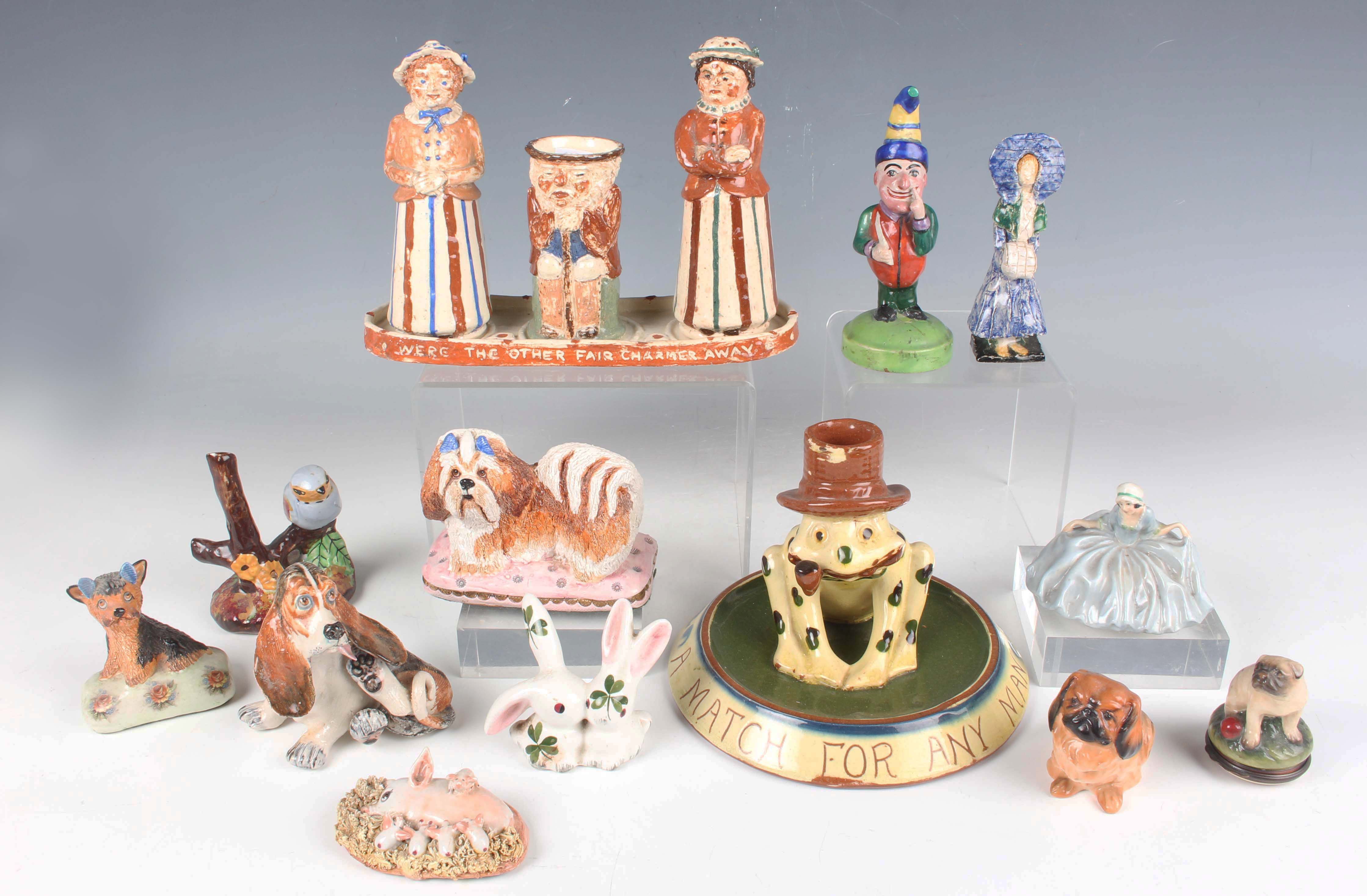Four Basil Matthews animal models, comprising three dogs and a pig with litter of piglets, a Halcyon Days enamel snuff box modelled as a pug dog, and a small group of other similar wares, including a cruet set modelled with figural salt and pepper and a Toby shaped mustard, a Crown Staffordshire Mr Punch, height 12cm, a small Royal Doulton Pekinese, K6, and a Watcombe motto ware match holder modelled with a seated dog wearing a hat on a circular base inscribed 'A MATCH FOR ANY MAN' (some faults).