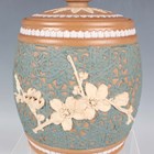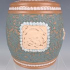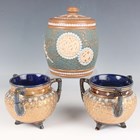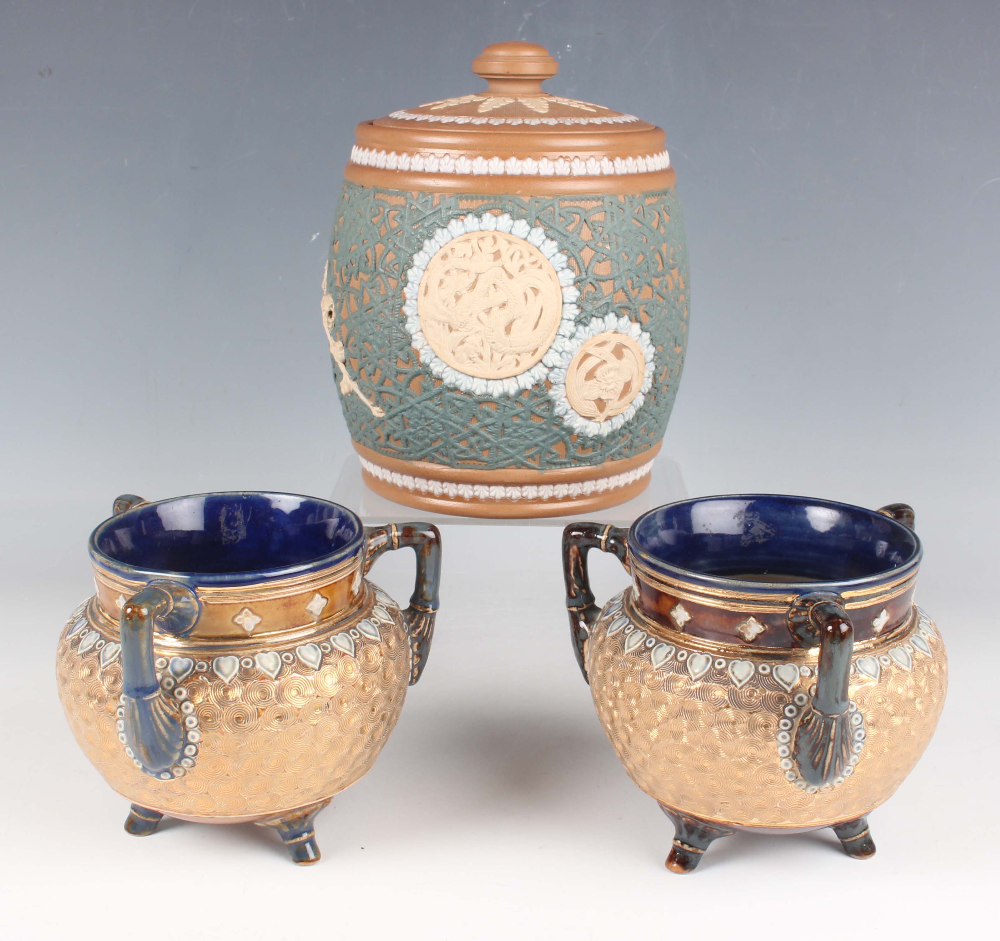 A Doulton Lambeth Silicon Stoneware aesthetic jar and cover, late 19th century, sprigged with panels depicting a fish, snake and iris flower against an eau de nil geometric floral ground heightened in low relief with a sprig of prunus blossom, impressed and incised marks to base, height 18cm, together with a pair of Royal Doulton stoneware cauldrons with gilt whorl ground, impressed marks, height 11.5cm.