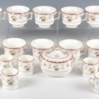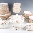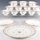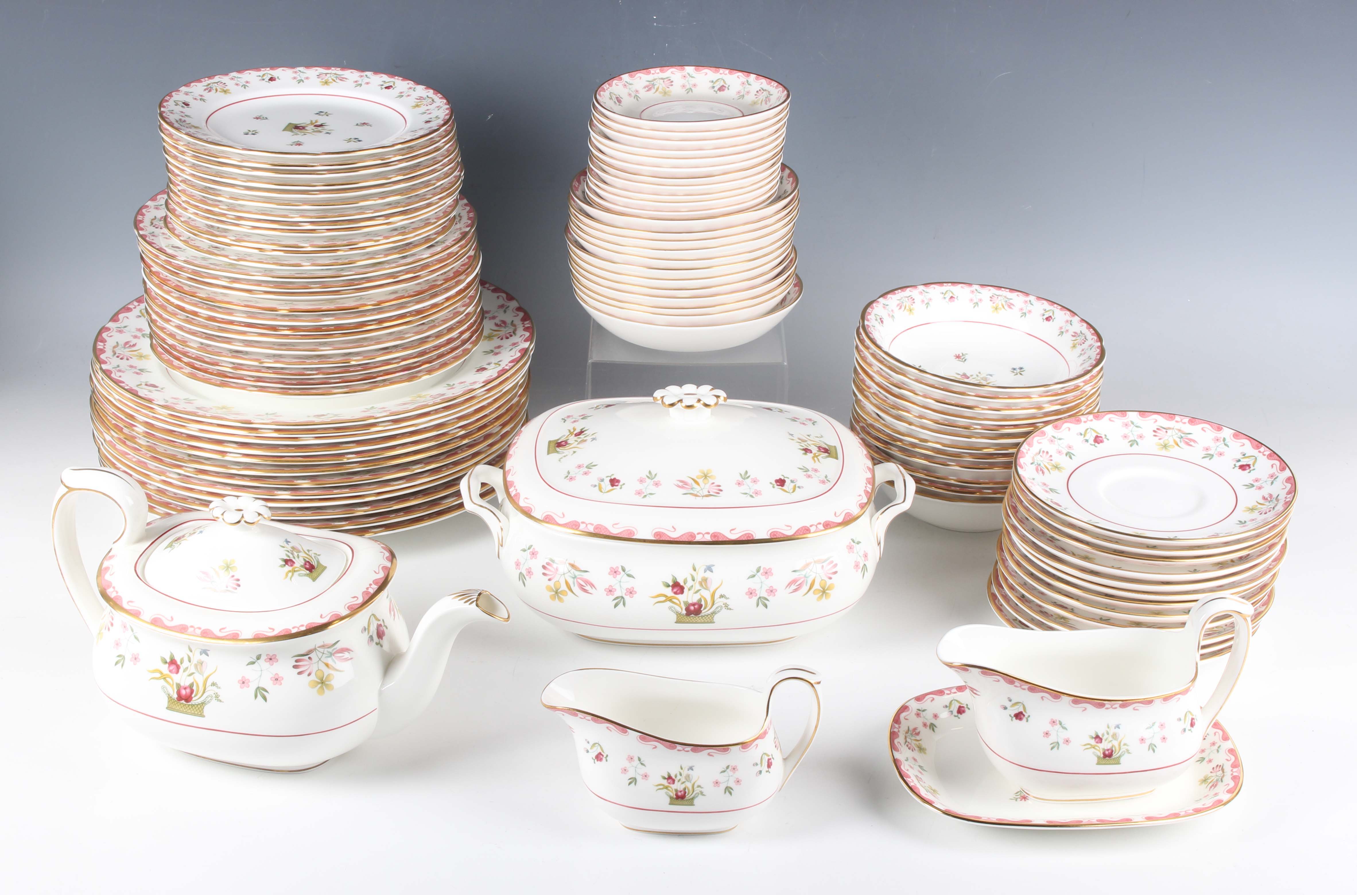 A Wedgwood Williamsburg Bianca pattern part service, comprising rounded rectangular tureen and cover, oval platter length 40cm, two oval vegetable dishes, twelve two-handled soup bowls and stands, twelve dinner plates, diameter 28.3cm, twelve dessert plates, diameter 21.3cm, twelve tea plates, diameter 18cm, twelve dessert bowls, two sauce boats and one stand, twelve teacups and saucers, eleven coffee cans and twelve saucers, teapot and cover (cracked), and a sucrier and cover.