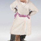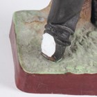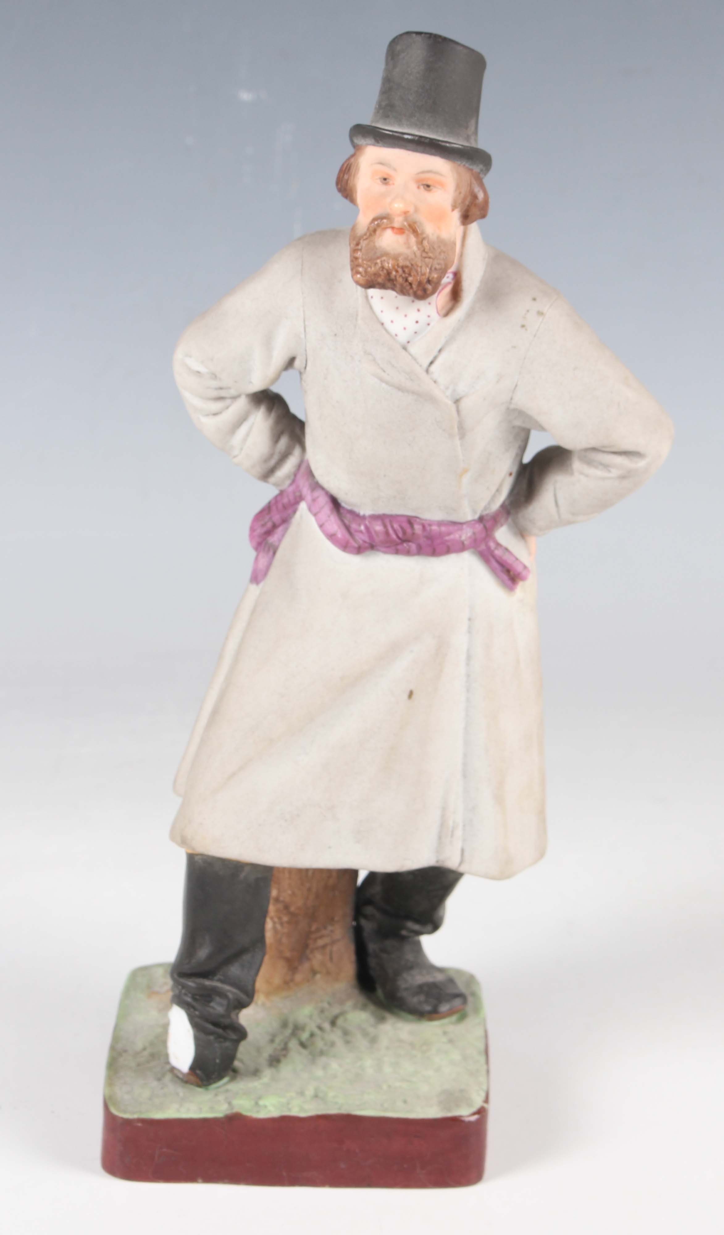 A Russian Gardner porcelain figure, Verbilki, Moscow, modelled as a bearded man wearing a long grey coat and tall black hat, on a naturalistic rectangular base with burgundy glazed edge, red printed and impressed marks to base, height 25cm (faults).