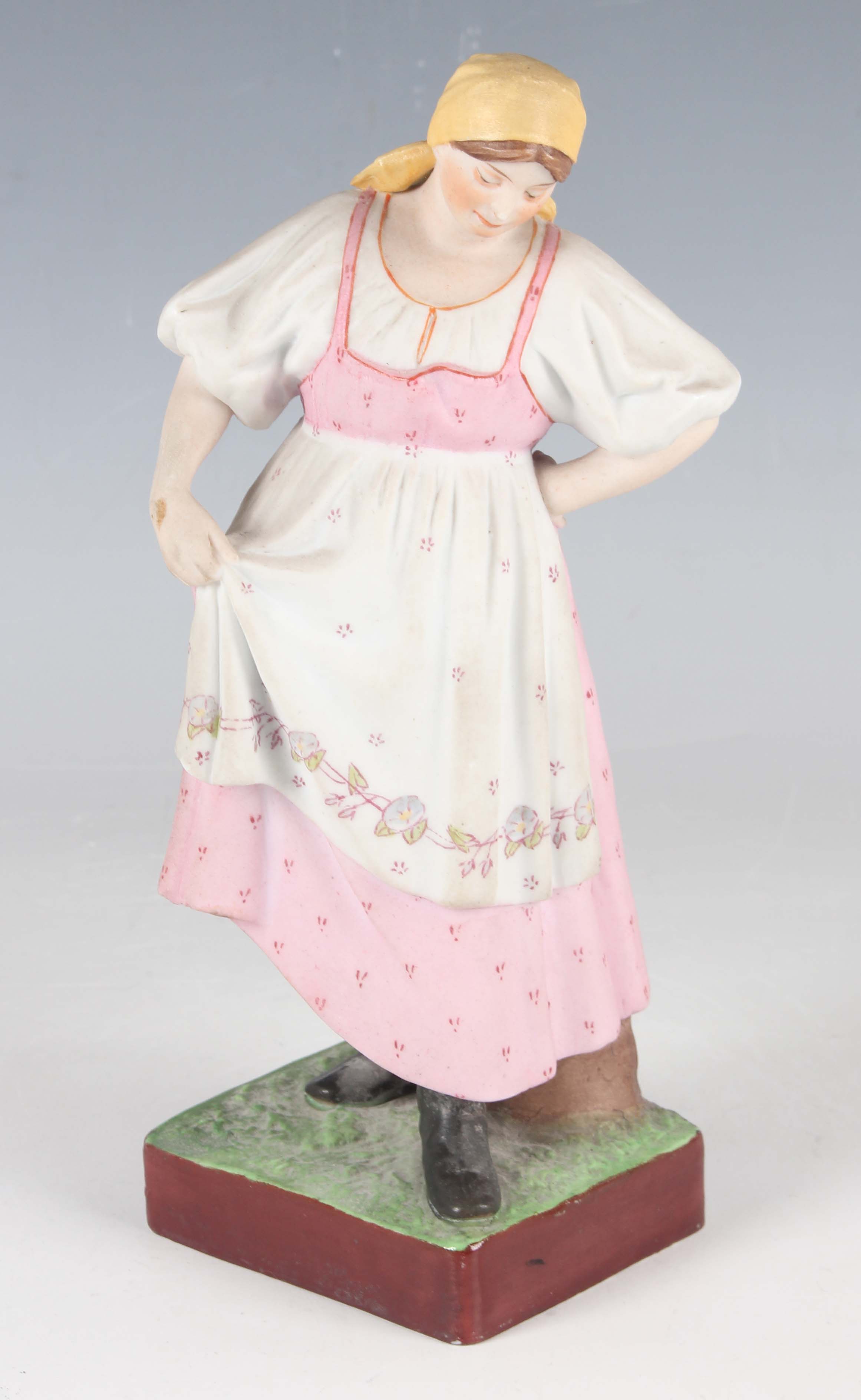 A Russian Gardner porcelain figure, Verbilki, Moscow, modelled as a dancing peasant lady wearing a yellow headscarf and floral apron, raised on a naturalistic rectangular base with burgundy glazed edge, red printed and impressed marks to base, height 21cm.