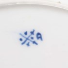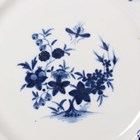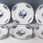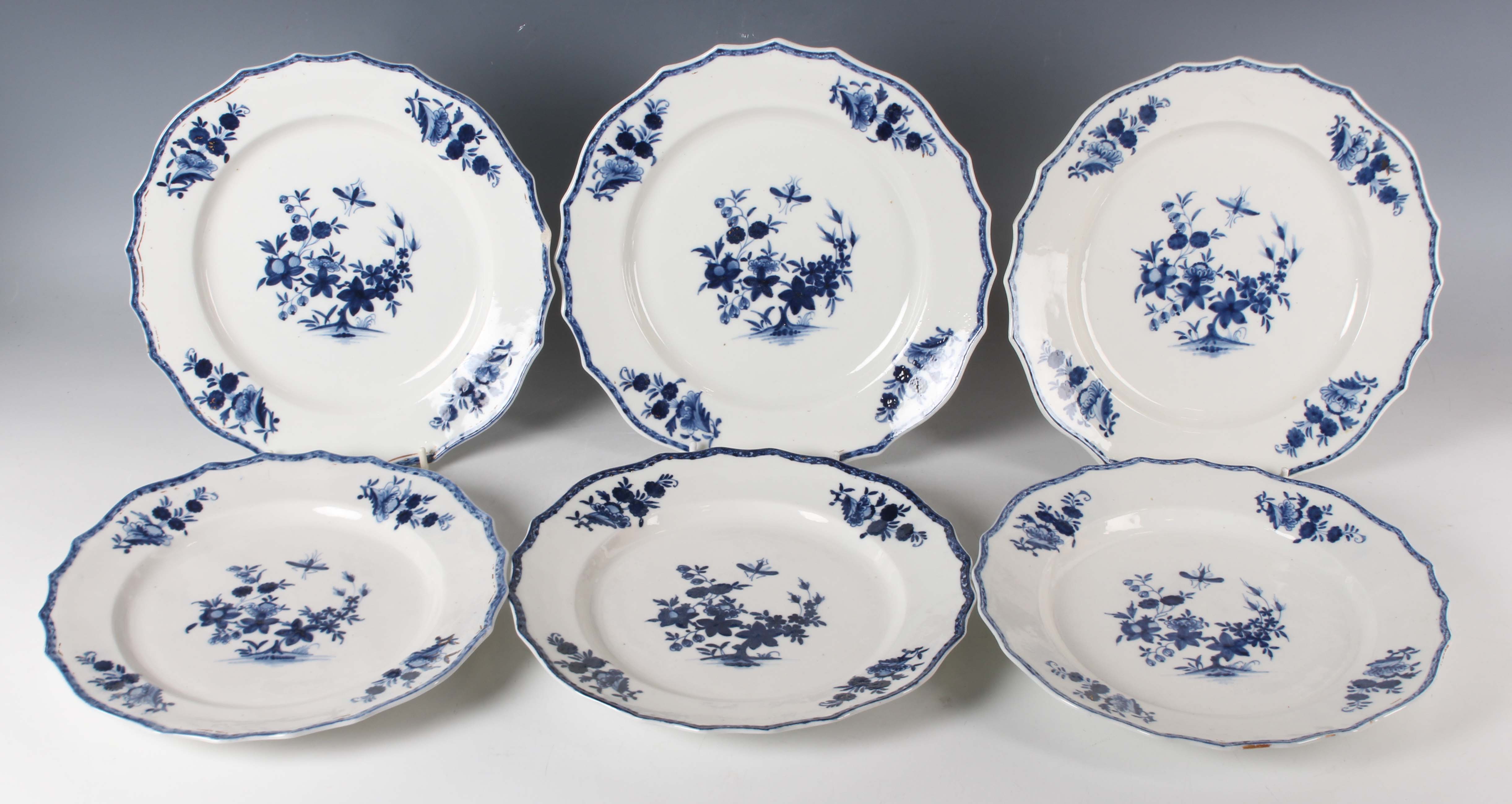 A set of six Tournay porcelain plates, late 18th/early 19th century, painted in underglaze blue Sèvres style with a butterfly hovering above a central arrangement of flowers, the shaped rims with four floral groups within a geometric floral band, underglaze blue and incised marks to bases, diameter 24.3cm (faults).