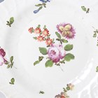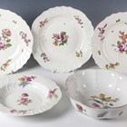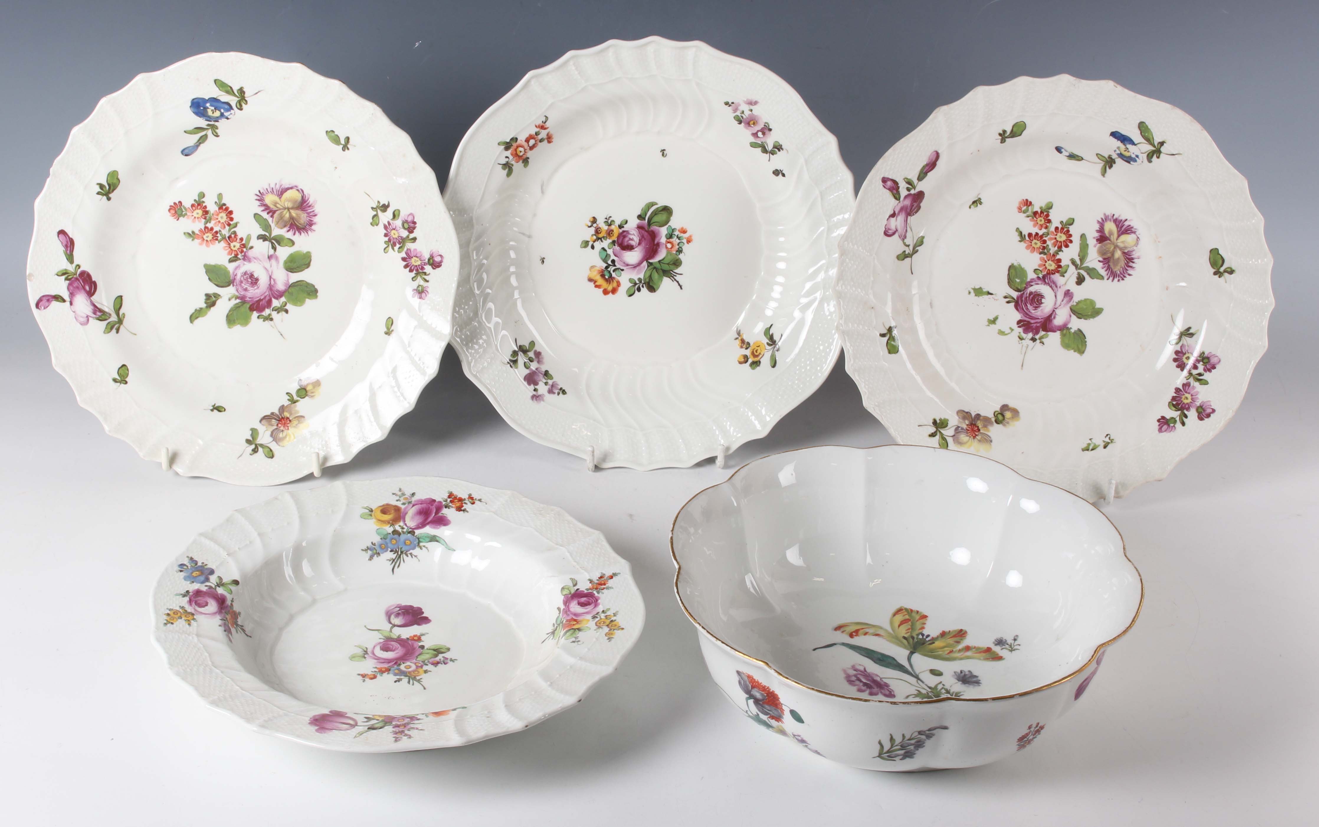 A Meissen porcelain lobed circular bowl, 18th century, painted to the interior base and exterior with Deutsche blumen beneath a gilt rim, underglaze blue crossed swords mark to base, diameter 23.5cm (cracked), together with four Vienna porcelain plates, 18th century, painted with flowers and foliage within basketweave moulded rims, underglaze blue, impressed, incised and painted marks to bases, largest 25cm diameter (faults).