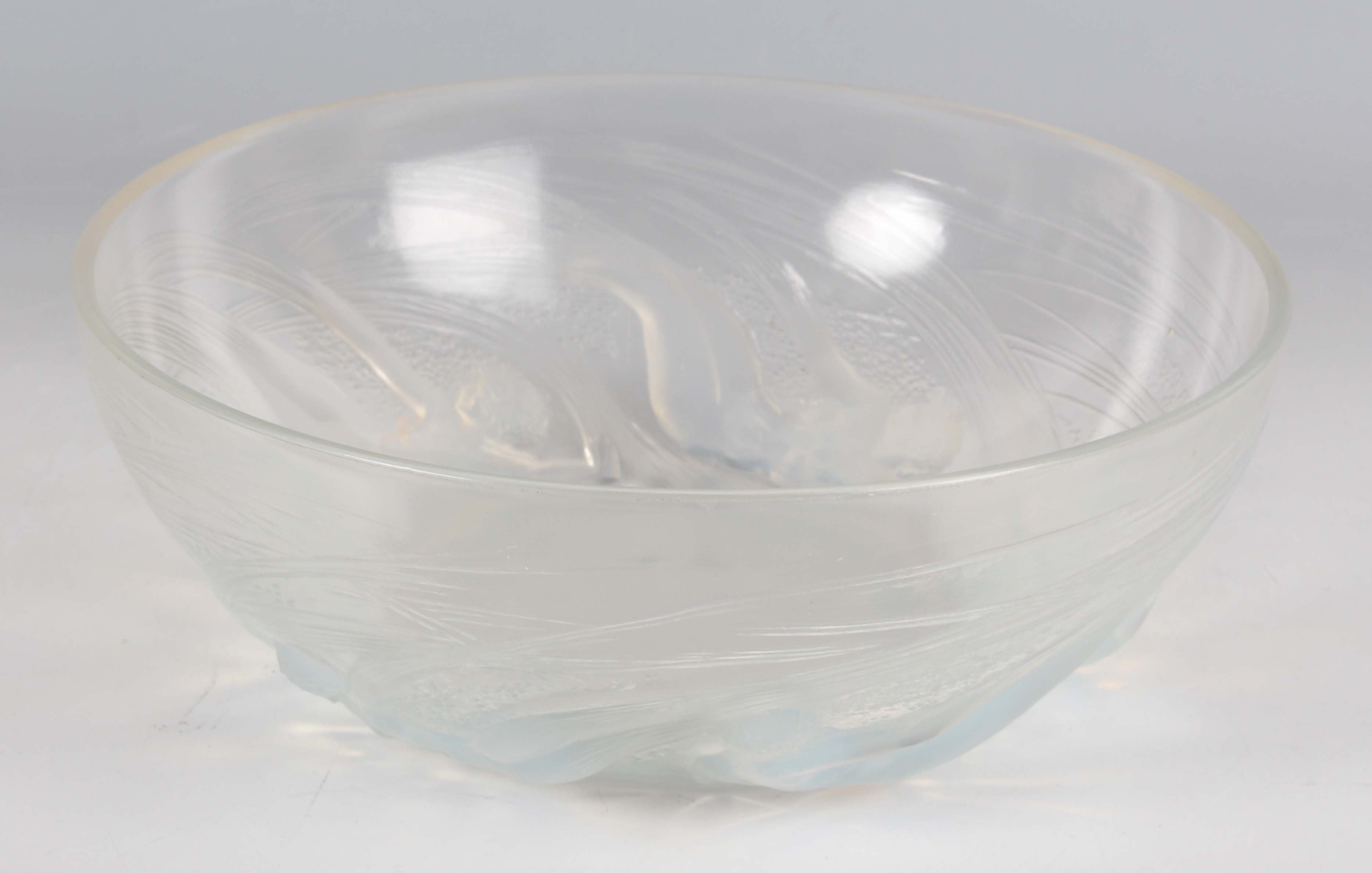 An Art Deco Lalique opalescent glass Ondines pattern circular bowl, 1930s, relief decorated with nude maidens amidst waves, indistinct moulded R. LALIQUE mark amidst decoration, shape No. 380, diameter 20.8cm.