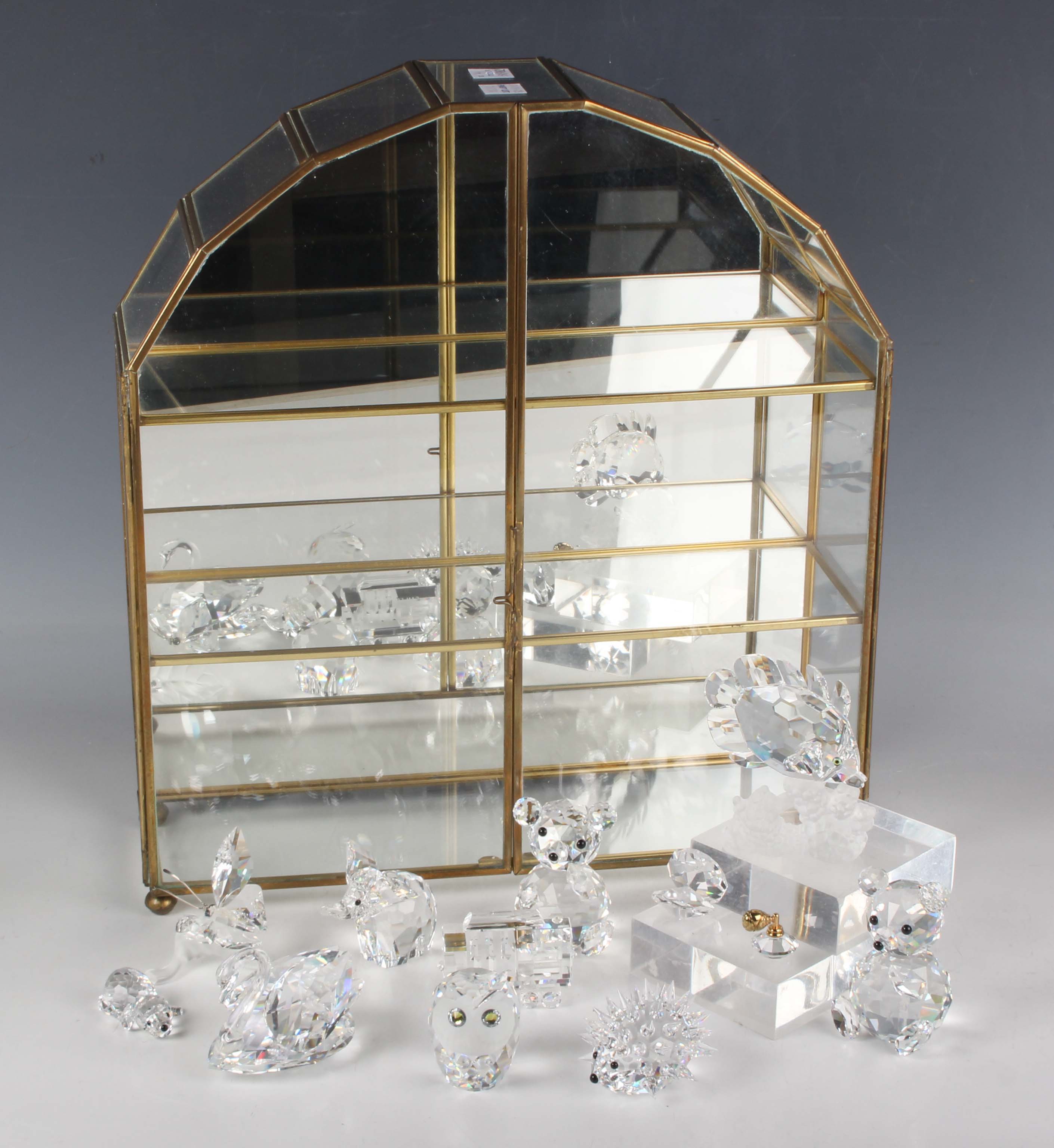A Swarovski Butterfly Fish on Coral from the South Seas group, designed by Michael Stamey, height 8cm, together with a small group of Swarovski animals and other crystal ornaments, and a mirror backed glazed display case (minor faults and repairs).