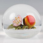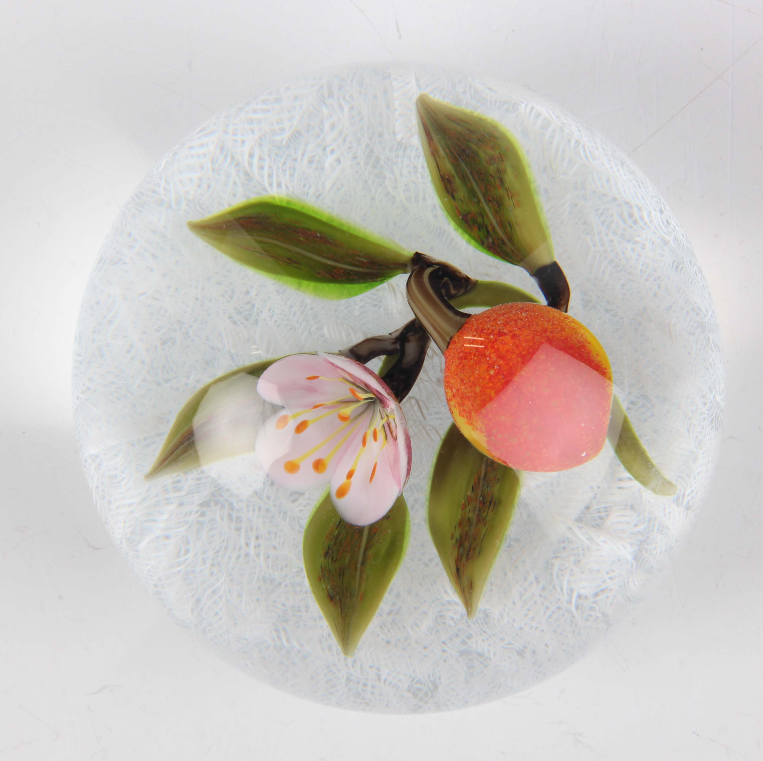 A David and Jon Trabucco paperweight, dated 2004, set with a peach fruit and open blossom flower on a leafy branch above a ground of haphazard latticinio threads, engraved mark and date to base, diameter approx 6.3cm.