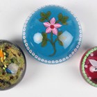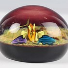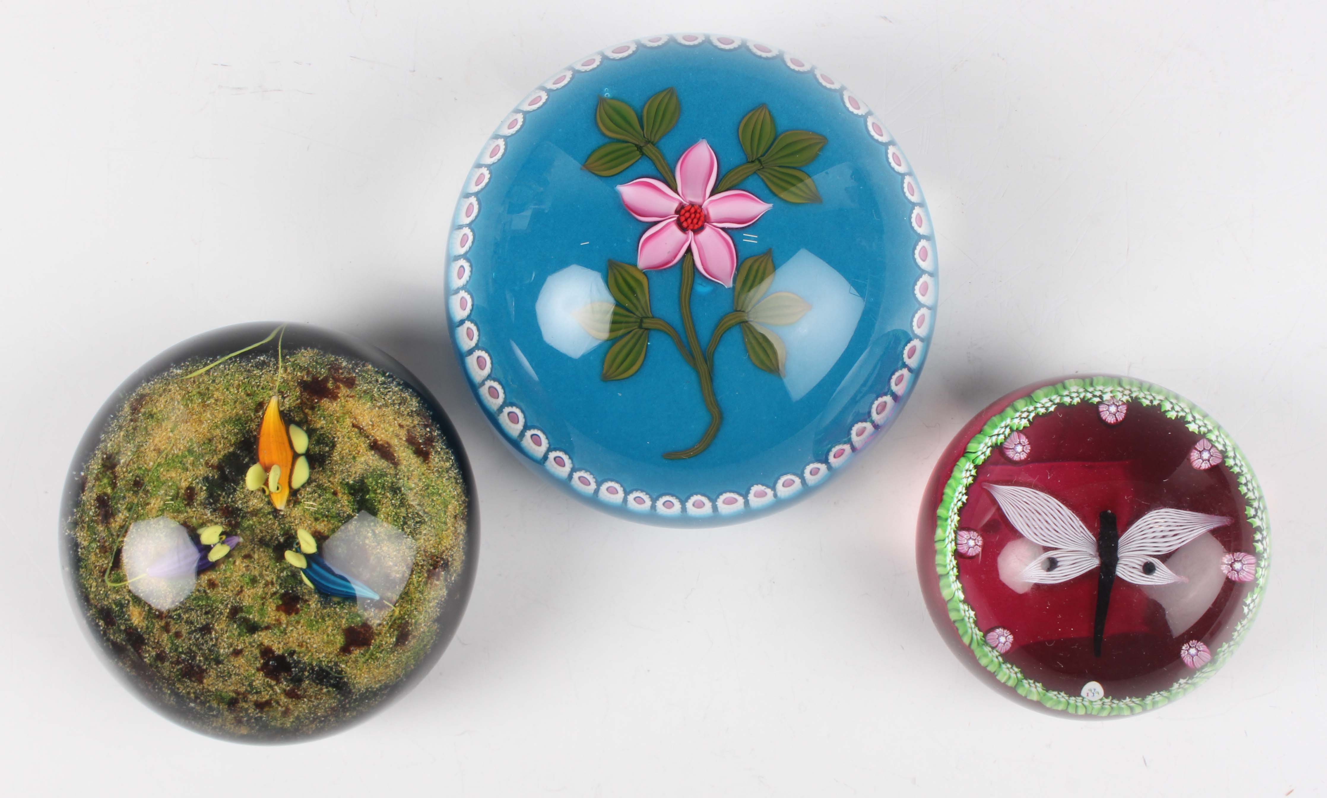 A William Manson limited edition Phoenix Paperweight, dated 2002, set with a pink flower in full bloom on a green leafy stem against a turquoise ground within a ring of pink and white millefiori canes, engraved mark and date to base, No. 1 of 50, diameter approx 8cm, together with a John Deacons J Glass paperweight, dated 1979, decorated with a butterfly against a translucent cranberry ground within a ring of millefiori canes, dated signature cane, diameter approx 5.5cm, and another similar probably Scottish paperweight, set with three colourful mice like creatures on a textured ground, diameter approx 7cm.
