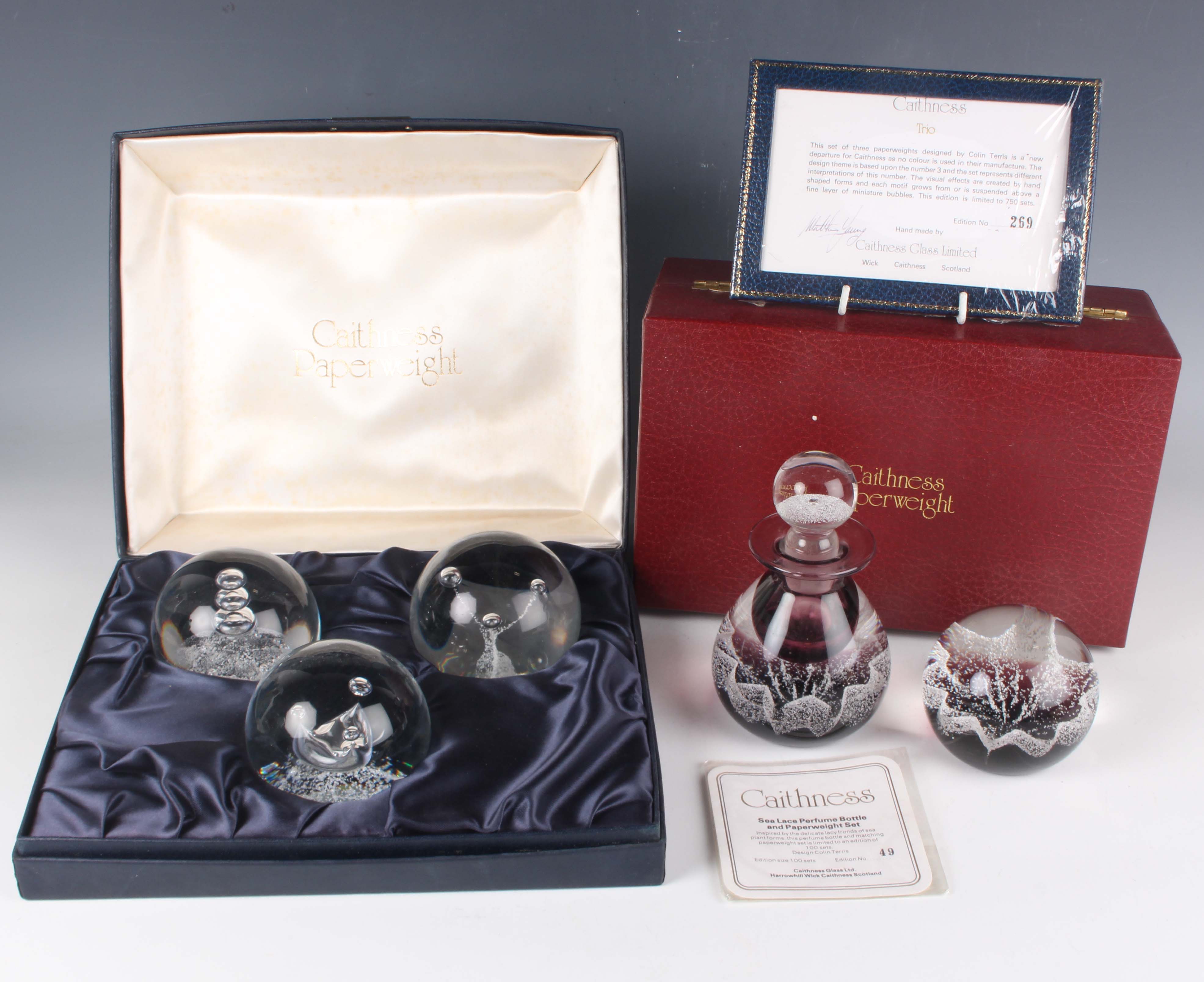 Two Caithness limited edition paperweight sets, the first the Sea Lace Perfume Bottle and Paperweight Set, designed by Colin Terris, No. 49 of 100, boxed with certificate, and the second Trio, designed by Colin Terris, dated 1976, comprising three weights designed around an interpretation of the number 3, No. 269 of 750, boxed with certificate.