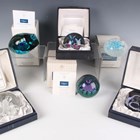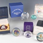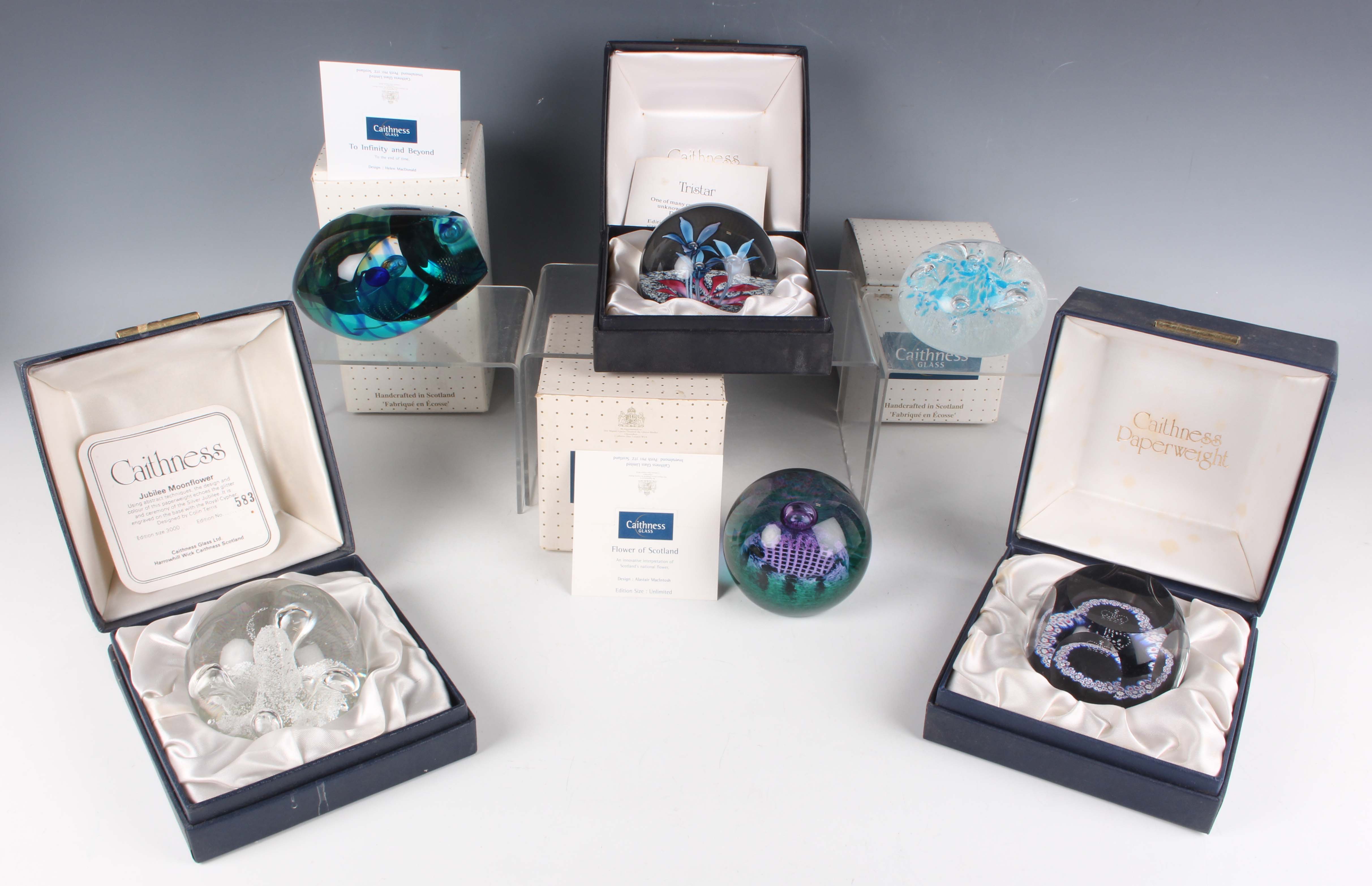 Three Caithness limited edition glass paperweights, each designed by Colin Terris, comprising Tristar, No. 274 of 750, Camelot, No. 151 of 750, and Jubilee Moonflower, No. 583 of 3000, each boxed with certificate, another Caithness limited edition paperweight designed by Helen MacDonald, To Infinity and Beyond, No. 308 of 500, boxed with certificate, and eight other paperweights, comprising Caithness Flower of Scotland, Caithness Crystal Carousel Blue, Caithness commemorative weight decorated with a crown, Wedgwood boxed weight commemorating the Queen's Silver Jubilee, dated 1977, a St. Tudy limited edition paperweight, an Edinburgh Crystal weight commemorating the British Red Cross, one by Sunderland Glassworks and an iridescent example by Glass Eye Studio, most boxed.