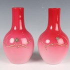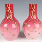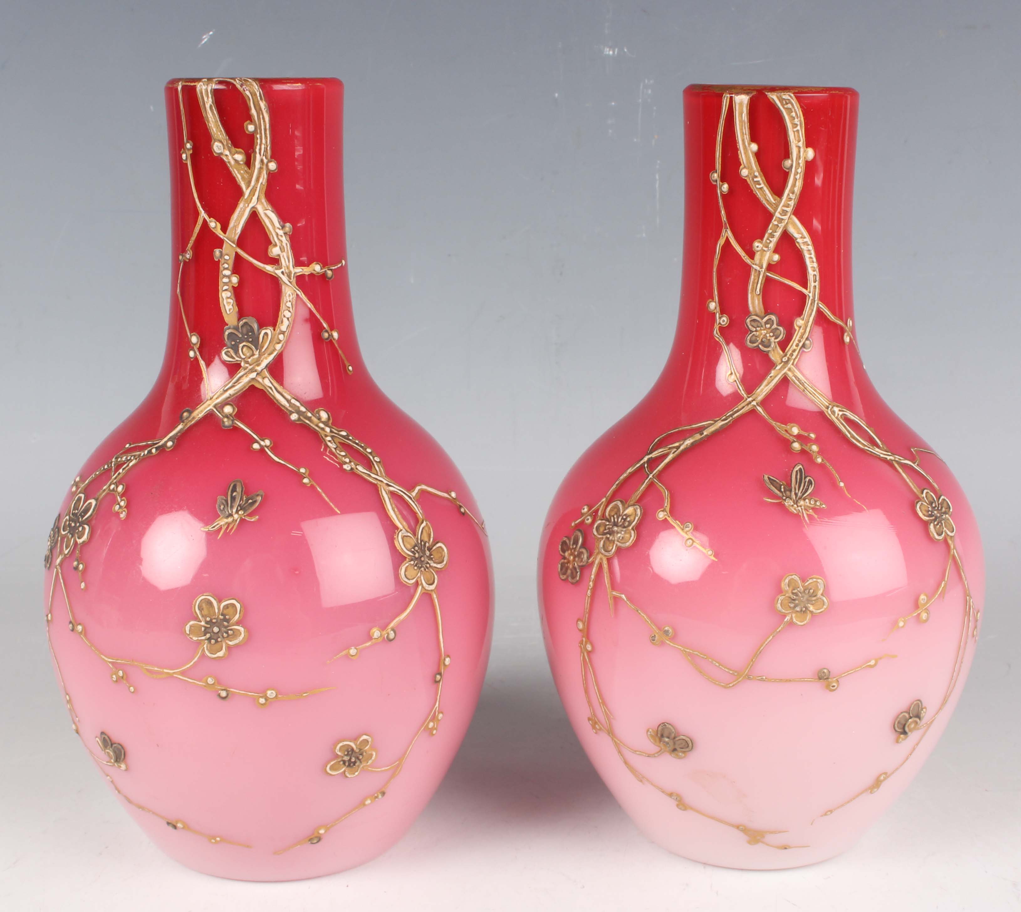 A pair of Harrach Peachblow vases, late 19th century, the graduated pink colour bodies relief paste gilt with blossom branches and insects, propeller mark to bases, height 16cm.
