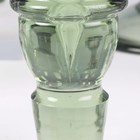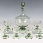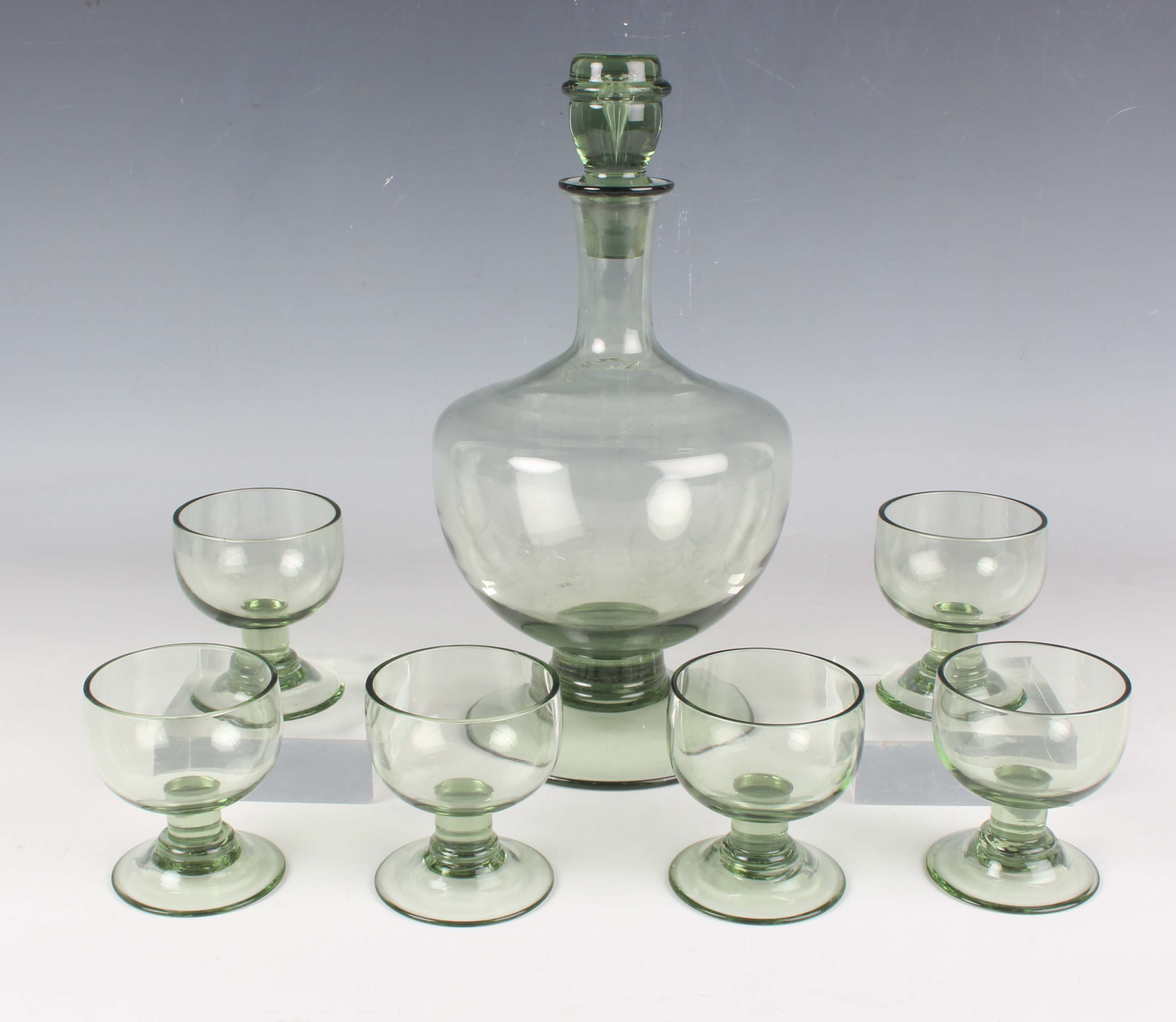 A Whitefriars sherry decanter and stopper and six matching glasses, circa 1940, designed by William Wilson, in sea green colour, shape M.67, height of decanter 25cm, height of glasses 7cm.