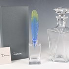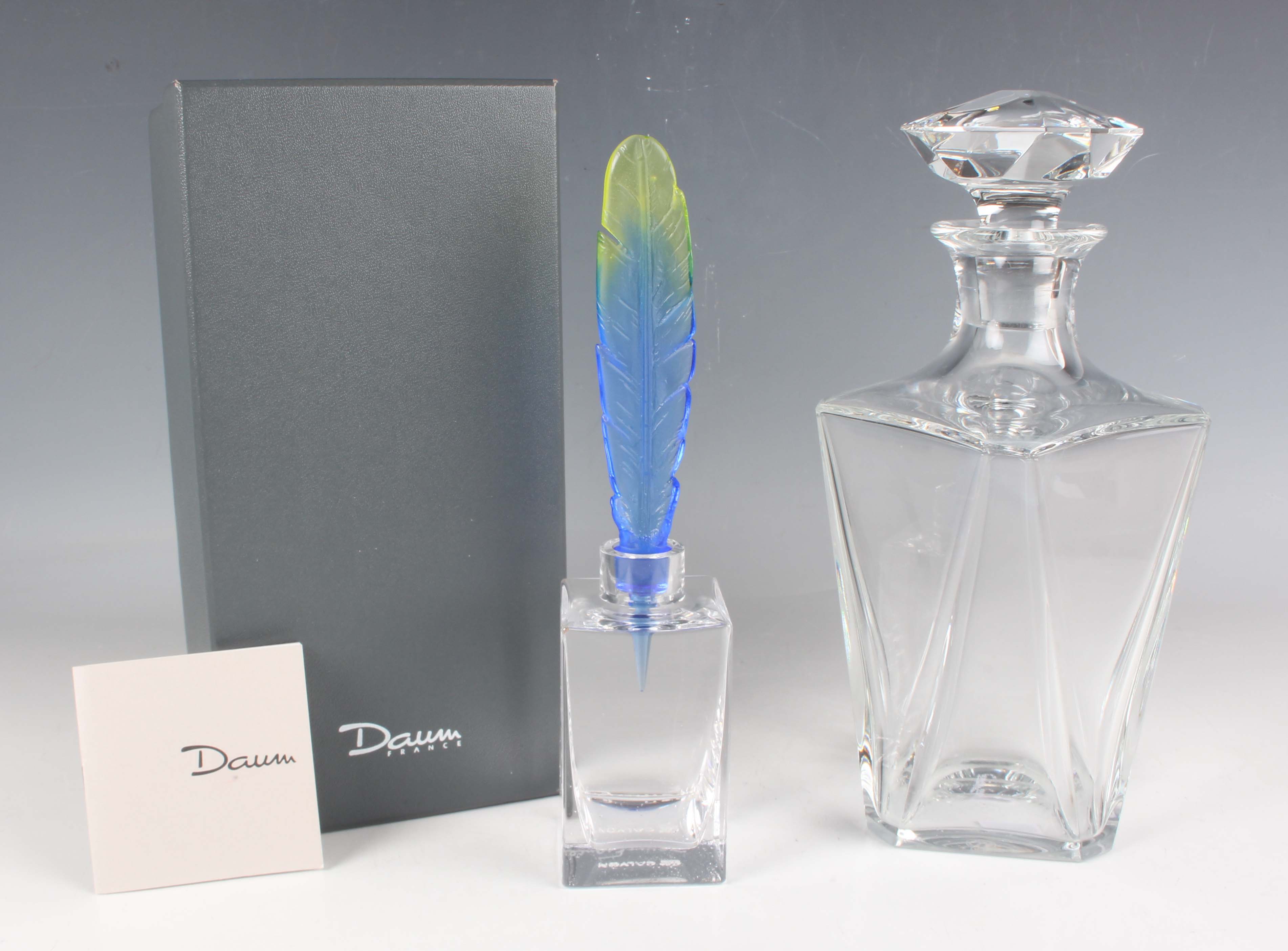 A Daum Feather Quill Cheyenne perfume bottle and stopper, late 20th century, designed by Hilton McConnico, Bleu Calyon colourway, engraved marks to base, height 22.5cm, boxed with some paperwork, together with a Baccarat clear glass decanter and stopper, height 23cm.