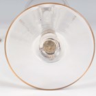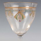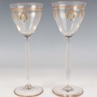 A pair of Theresienthal glasses, early 20th century, the ogee bowls enamelled and gilt with secessionist style medallions pendant from a green dotted line, the swollen clear stems on gilt edged circular feet, height 20.3cm.