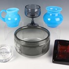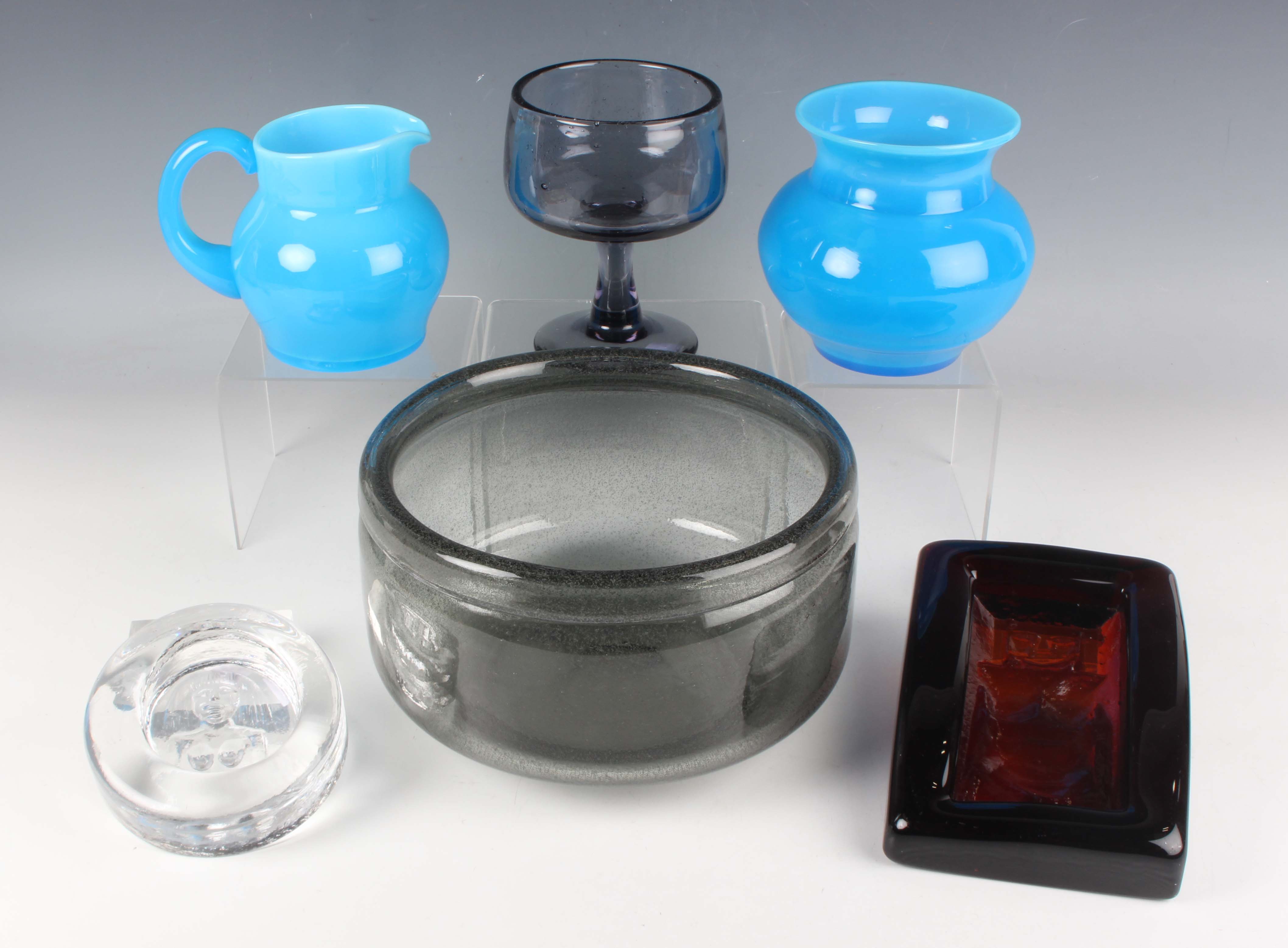 An Erik Höglund Kosta Boda stamped glass bowl or dish, originally designed circa 1957, the dark amber coloured glass of dished rectangular shape with the motif of a female nude, indistinct incised mark to base, length 18cm, together with five other pieces of Erik Höglund glass, comprising a flint circular dish stamped with a half length female nude, diameter 11cm, a turquoise glass vase, height 12.5cm, and matching jug, height 11.3cm, a stemmed goblet, height 13.5cm, and a grey tinted circular bowl with tiny air bubble inclusions, diameter 21.5cm, various engraved marks to bases.