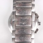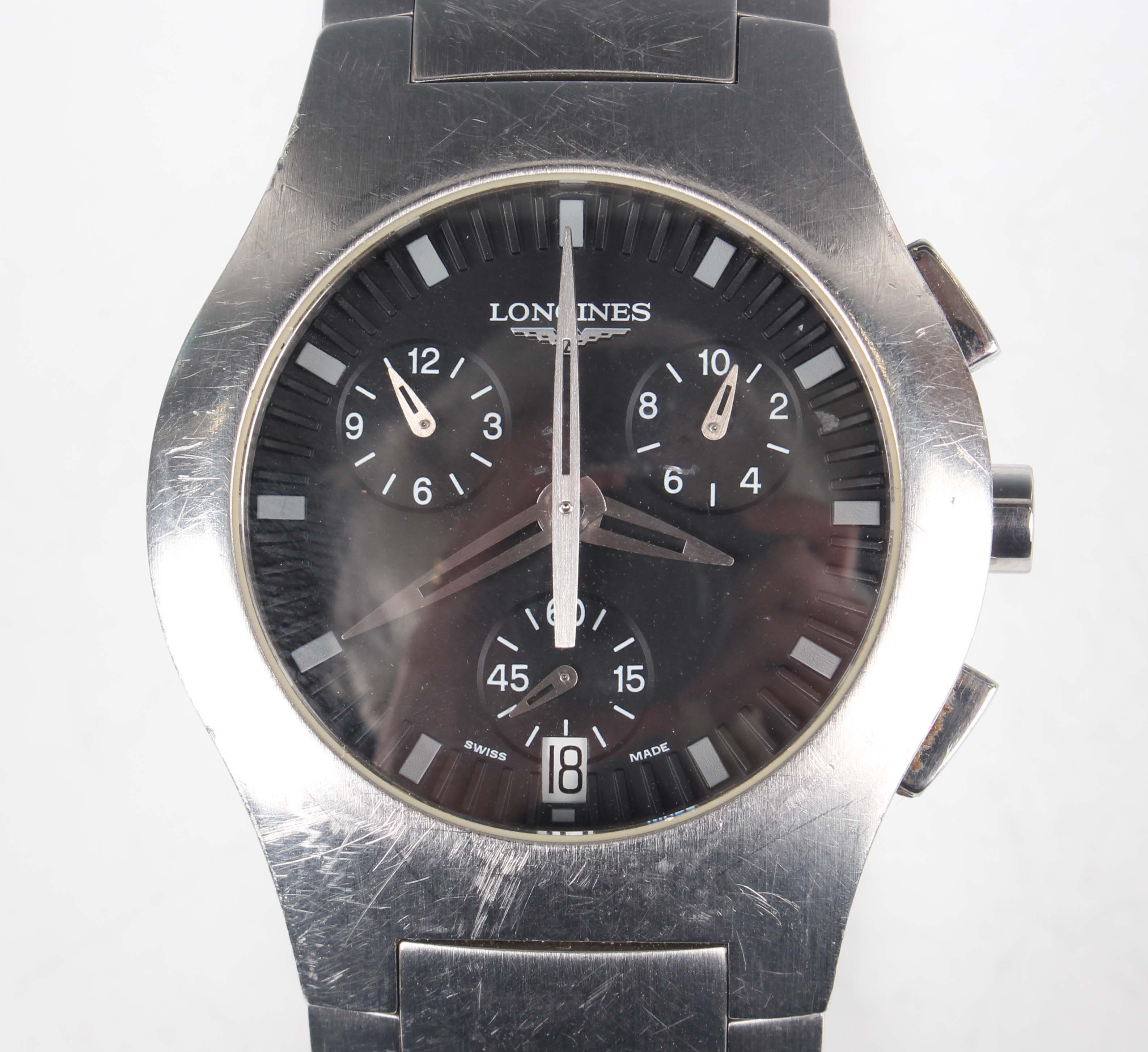 A Longines stainless steel gentleman's chronograph bracelet wristwatch, Ref. L3 618 4, with quartz movement, the signed black dial with baton hour markers, centre stop seconds, three subsidiary dials and date aperture, the signed case back detailed 'L3 618 4' and numbered '29314112', the bracelet with signed concealed double foldover clasp, case width 3.8cm.