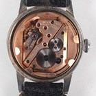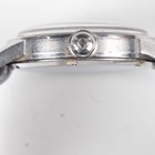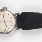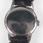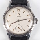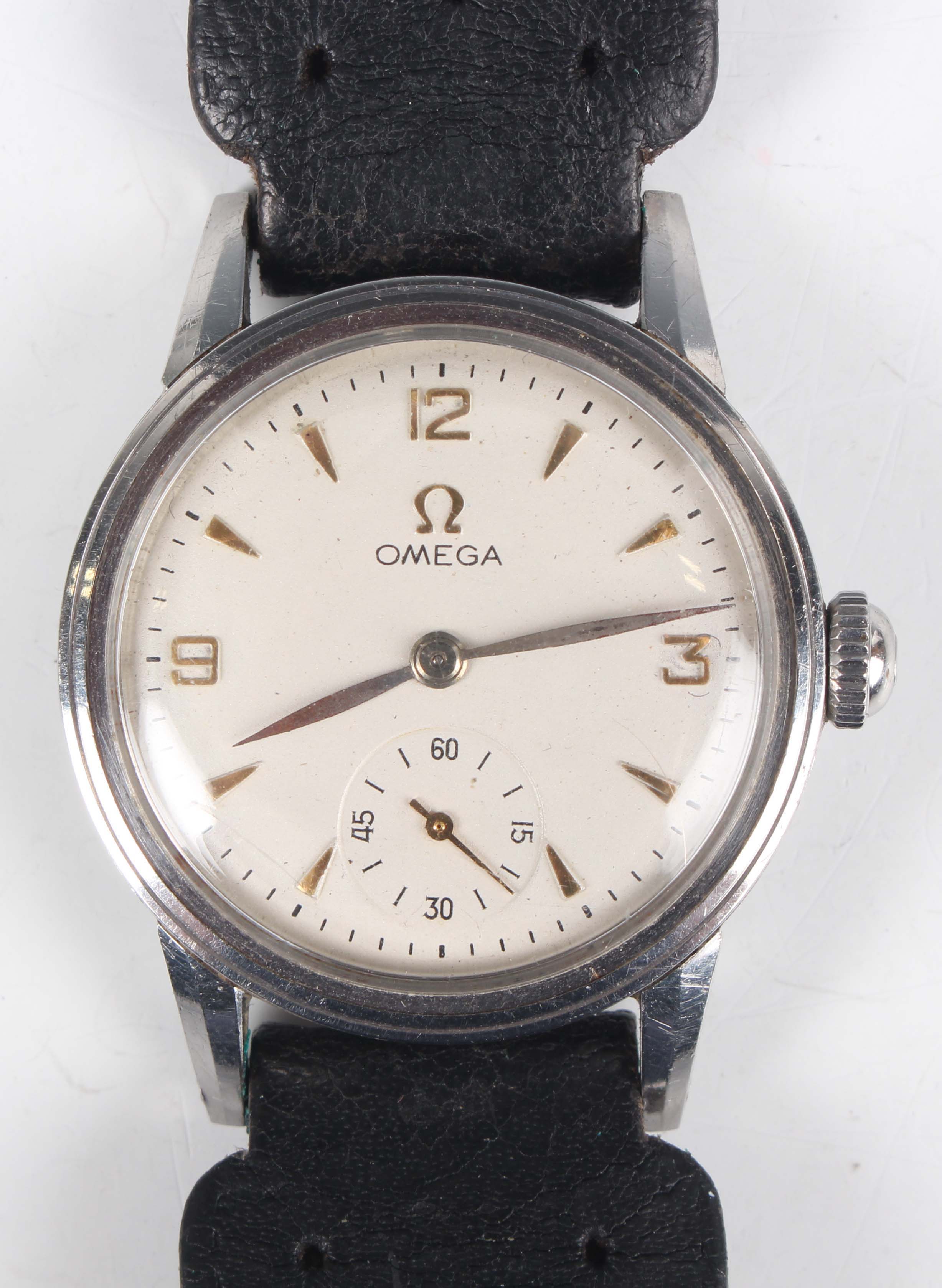 An Omega stainless steel circular cased gentleman's wristwatch, Ref. 2300-23, circa 1947, the signed and jewelled manual wind movement numbered '11500290', the signed silvered dial with gilt Arabic numeral and arrowhead hour markers and date aperture, the signed case back interior numbered '2300-23 SC', case diameter 3cm, on a black leather strap.