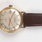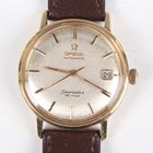 An Omega Automatic Seamaster De Ville 18ct gold circular cased gentleman's wristwatch, Ref. 165/6-5020, circa 1964, the signed and jewelled 562 caliber movement numbered '21288858', the signed silvered dial with baton hour markers and date aperture, the case back with Seamaster emblem, the signed case back interior numbered '165/6-5020' above '327668', Birmingham 1964, case diameter 3.5cm, on a brown leather strap.